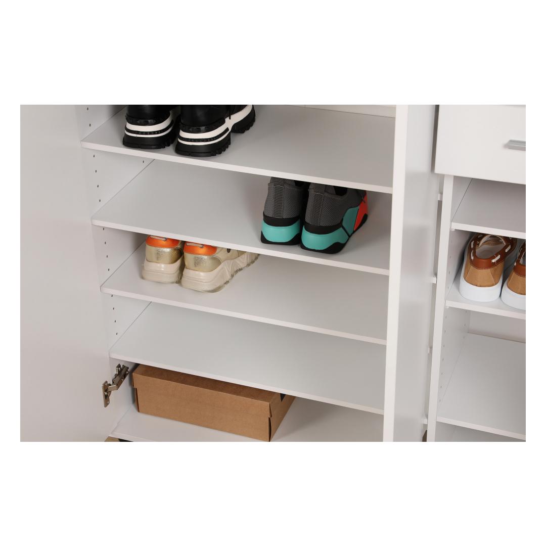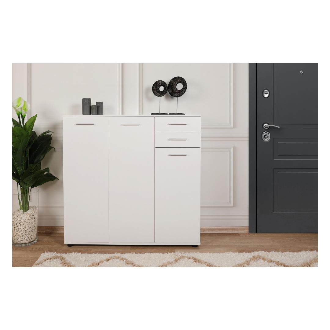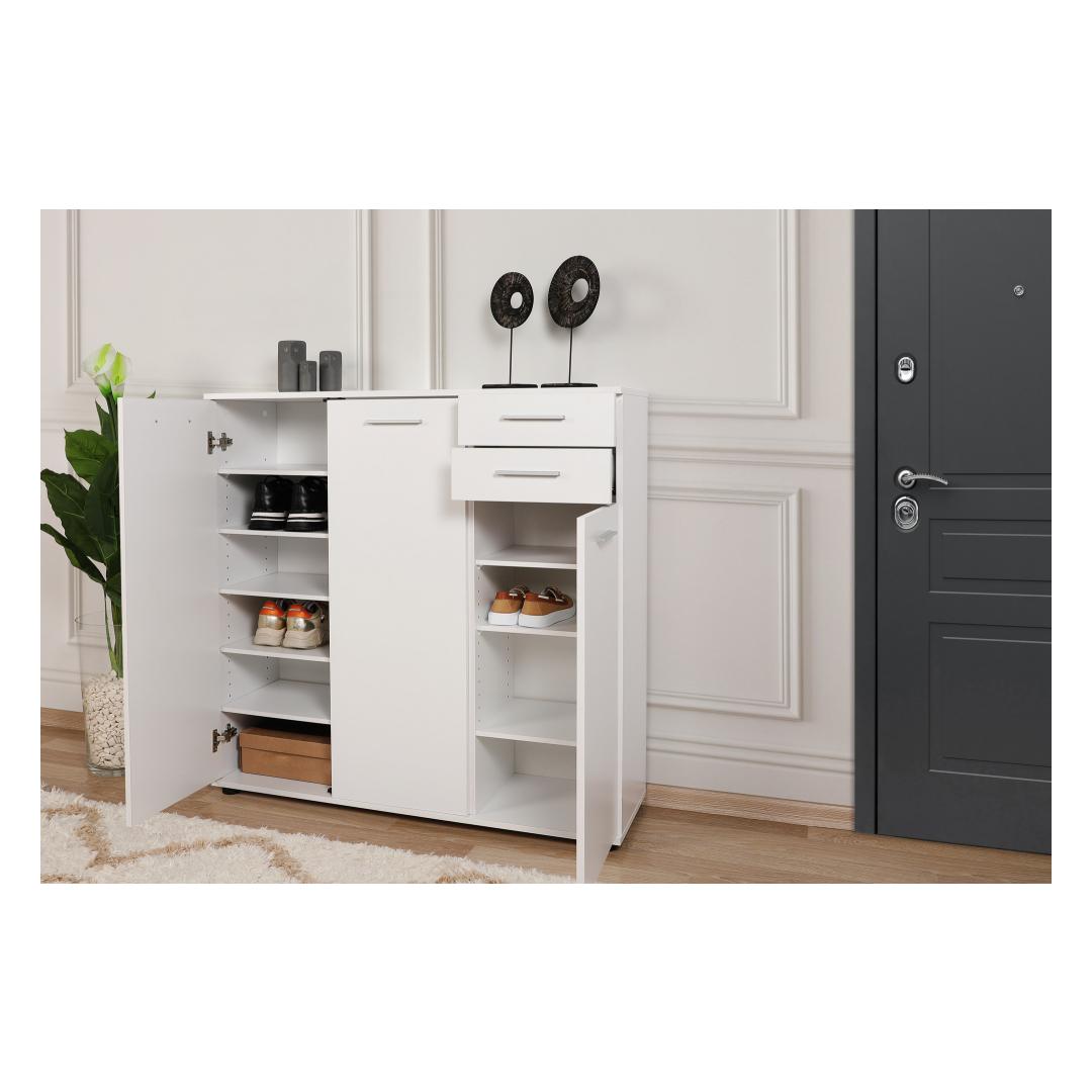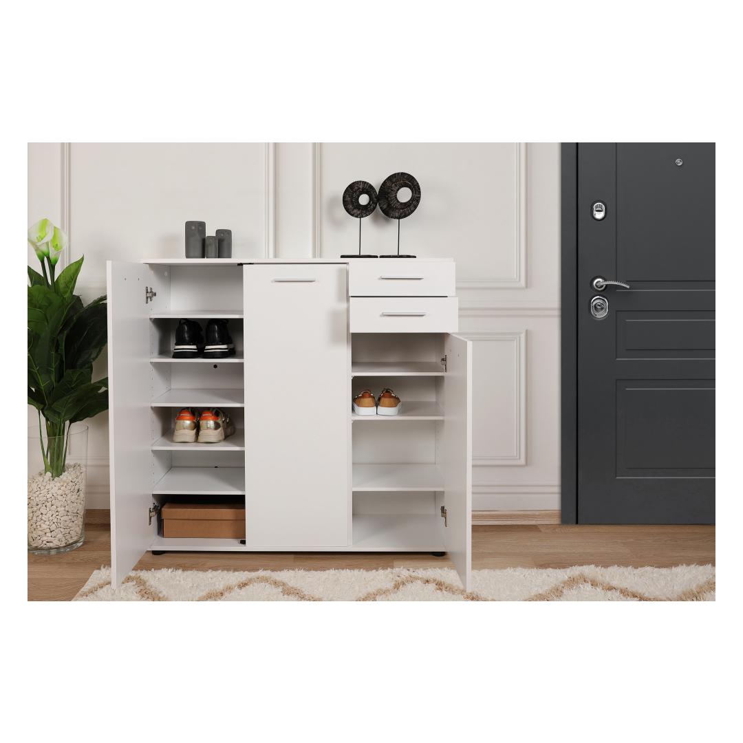 Muunna kotisi tyylikkäällä ja toimivalla kenkäkaapillaOletko kyllästynyt kompastelemaan kenkiin, jotka ovat hajallaan eteisessäsi? kaipaatko tyylikästä ja organisoitua ratkaisua, jossa jalkineesi pysyvät siististi säilytettyinä?Älä etsi kauempaa kuin hienosta kenkäkaapistamme!Koe täydellinen yhdistelmä tyyliä ja toiminnallisuuttaTämä huolellisesti valmistettu kenkäkaappi on suunniteltu parantamaan kotisi esteettistä ilmettä samalla kun se tarjoaa runsaasti tilaa rakkaiden kenkiesi säilyttämiseen. Sen tyylikäs ja moderni muotoilu yhdistettynä valkoiseen väriin täydentää vaivattomasti mitä tahansa sisustusta ja tuo tilaan tyylikkyyttä.Pysy järjestyksessä ja säästä tilaaKahden tilavan laatikon ja lukuisten hyllyjen ansiosta kenkäkaappi tarjoaa täydellisen ratkaisun kenkiesi pitämiseen järjestyksessä ja helposti saatavilla. Sinun ei tarvitse tuhlata aikaa oikean kenkäparin etsimiseen! suuri kapasiteetti takaa, että kaikki kenkäsi lenkkareista korkokenkiin löytävät paikkansa. Turvallinen ja monipuolinen muotoiluKenkäkaappi on paitsi esteettisesti miellyttävä, myös erittäin toimiva. Se voidaan helposti kiinnittää seinään vakauden vuoksi ja pitää kenkäsi turvassa. Tämän monipuolisen muotoilun ansiosta se voidaan sijoittaa mihin tahansa huoneeseen, olipa kyseessä sitten eteinen, makuuhuone tai jopa vaatehuone. Tekniset tiedot:Materiaali:Materiaali:Materiaali:Materiaali:Materiaali:Materiaali:Materiaali:Materiaali:Materiaali:Materiaali:Materiaali:Materiaali:Materiaali:100 % melamiinipäällysteinen lastulevyPaksuus:16 mmMitat:Leveys:108 cmKorkeus:108 cmKorkeus:108 cmSyvyys:35 cmLokeron koko:Leveys:36 cmKorkeus:12 cmKorkeus:35 cmVäri: valkoinenVärjennä kotiasi ja sano hyvästit kenkien kiillottamiselle poikkeuksellisella kenkäkaapilla. Tilaa nyt ja koe täydellinen yhdistelmä tyyliä, toiminnallisuutta ja organisointia! Väri: valkoinen