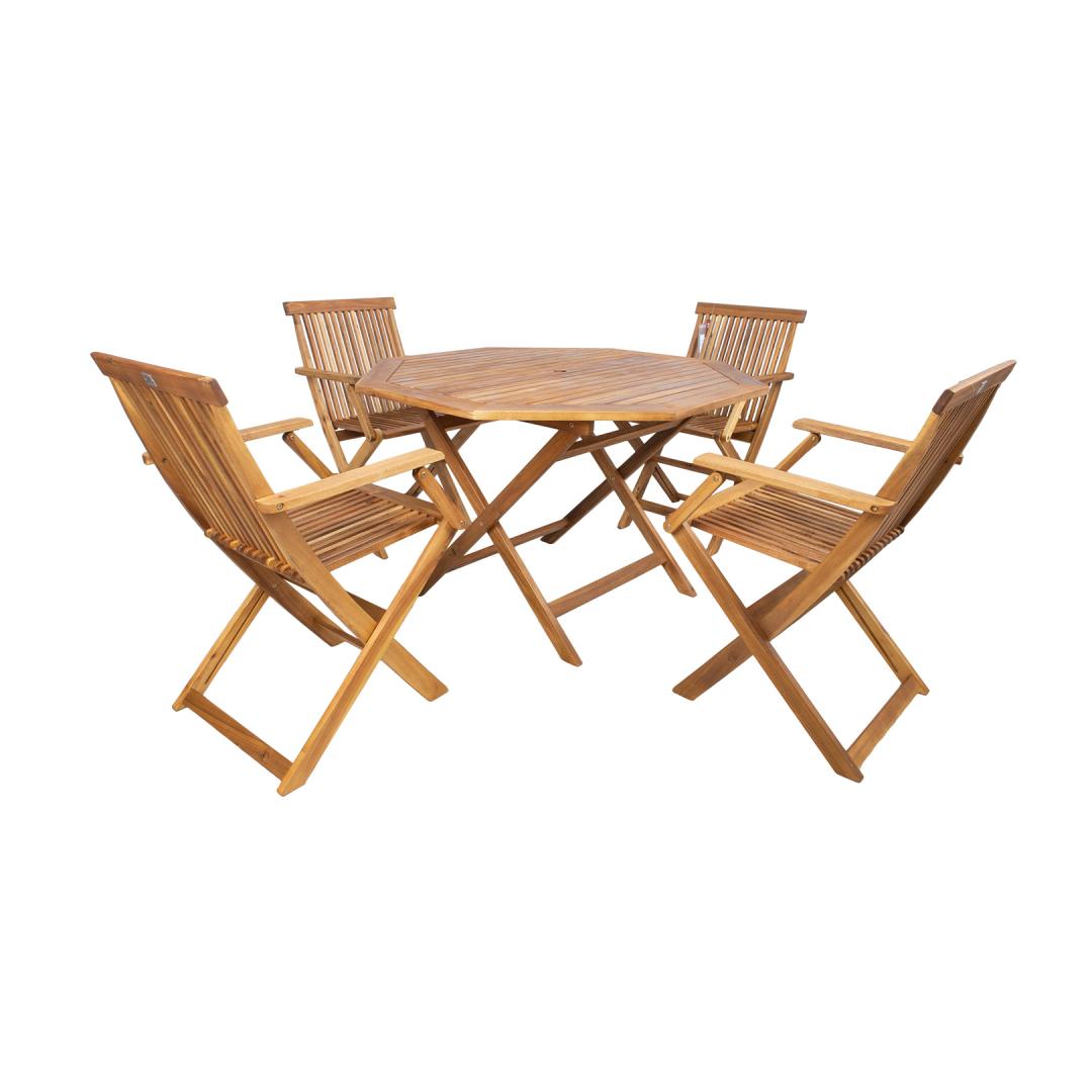 Puutarhakalustesarja FINLAY pöytä ja 4 tuolia kahvoilla. Pöytä ja tuolit on valmistettu akaasiapuusta ja viimeistelty puunsuojaöljyllä. Pöydän mitat ovat 120x120xK72cm. Tuolien kokonaismitat ovat 54x57xH86cm. Istuimen leveys on 43cm, istuimen syvyys 39cm ja istuimen korkeus 45,5cm. Painoraja 90kg. Tuote kestää vaihtelevia sääolosuhteita. KESTÄVYYS: Puu on elävä, luonnollinen materiaali, joka muuttaa ulkonäköään sääolosuhteiden mukaan. Puhdista huonekalut säännöllisesti, suojaa kosteudelta ja UV-säteiltä. Kevyt hionta ja uusi öljykerros vähintään kerran vuodessa riittää antamaan kalusteillesi uuden ilmeen. HUOLTO: Kesäkauden päätyttyä suosittelemme puutarhakalusteiden säilyttämistä sisätiloissa. Kesäkauden jälkeen huonekalut kannattaa jättää puutarhaan jäähtymään ja kuivumaan ennen varastointia. Käytä säilytykseen kuivaa ja hyvin ilmastoitua tilaa. Suojaa huonekalut suoralta auringonvalolta varastoinnin aikana. Puutarhakalustesarja FINLAY pöytä ja 4 tuolia kahvoilla. Pöytä ja tuolit on valmistettu akaasiapuusta ja viimeistelty puunsuojaöljyllä. Pöydän mitat ovat 120x120xK72cm. Tuolien kokonaismitat ovat 54x57xH86cm. Istuimen leveys on 43cm, istuimen syvyys 39cm ja istuimen korkeus 45,5cm. Painoraja 90kg. Tuote kestää vaihtelevia sääolosuhteita. KESTÄVYYS: Puu on elävä, luonnollinen materiaali, joka muuttaa ulkonäköään sääolosuhteiden mukaan. Puhdista huonekalut säännöllisesti, suojaa kosteudelta ja UV-säteiltä. Kevyt hionta ja uusi öljykerros vähintään kerran vuodessa riittää antamaan kalusteillesi uuden ilmeen. HUOLTO: Kesäkauden päätyttyä suosittelemme puutarhakalusteiden säilyttämistä sisätiloissa. Kesäkauden jälkeen huonekalut kannattaa jättää puutarhaan jäähtymään ja kuivumaan ennen varastointia. Käytä säilytykseen kuivaa ja hyvin ilmastoitua tilaa. Suojaa huonekalut suoralta auringonvalolta varastoinnin aikana.