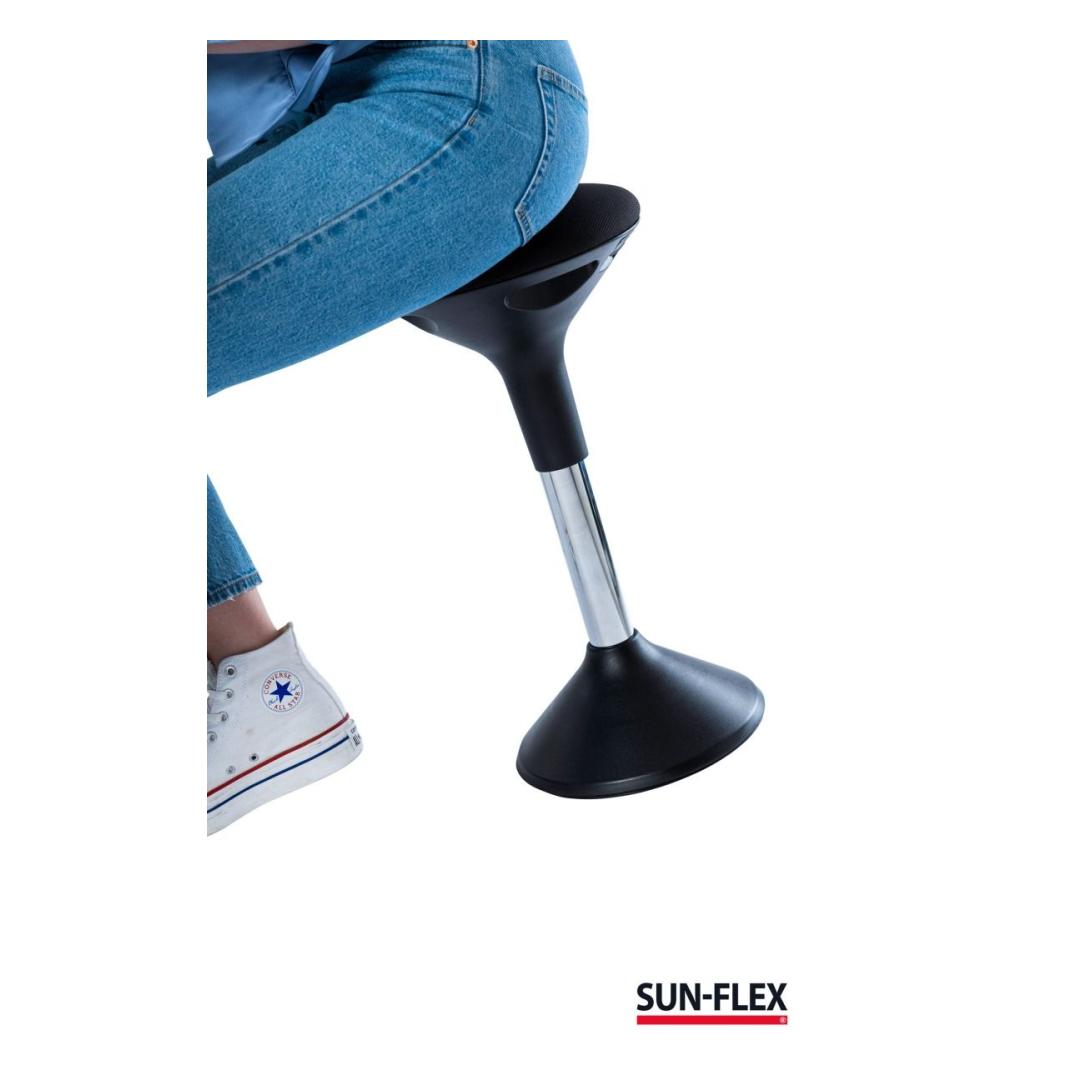 With the SUN-FLEX®Active chair, you can intuitively stimulate your heart muscles, strengthen your back muscles and improve blood circulation. We recommend sitting with your legs balanced. This puts your body in a position similar to riding a bicycle or horseback riding. The active sitting function is ensured by the dome-shaped base. Thanks to the excellent selection of high-quality materials and the ease of use - simply pull the lever under the seat to adjust the height - the SUN-FLEX®Active will be your favorite part of your workplace for years to come. • Product dimensions (W x H x D): 31 x 71 x 31 cm • Seat: Ø31 cm, base: Ø29 cm • Adjustable height 62-71 cm, gas spring • Anti-slip base, grooved natural rubber base • Chair covered with fabric (110,000 Martindale) • Frame made of steel covered with ABS plastic • Maximum load capacity: 120 kg • Material: fabric, steel, ABS plastic • Color: frame black, seat black