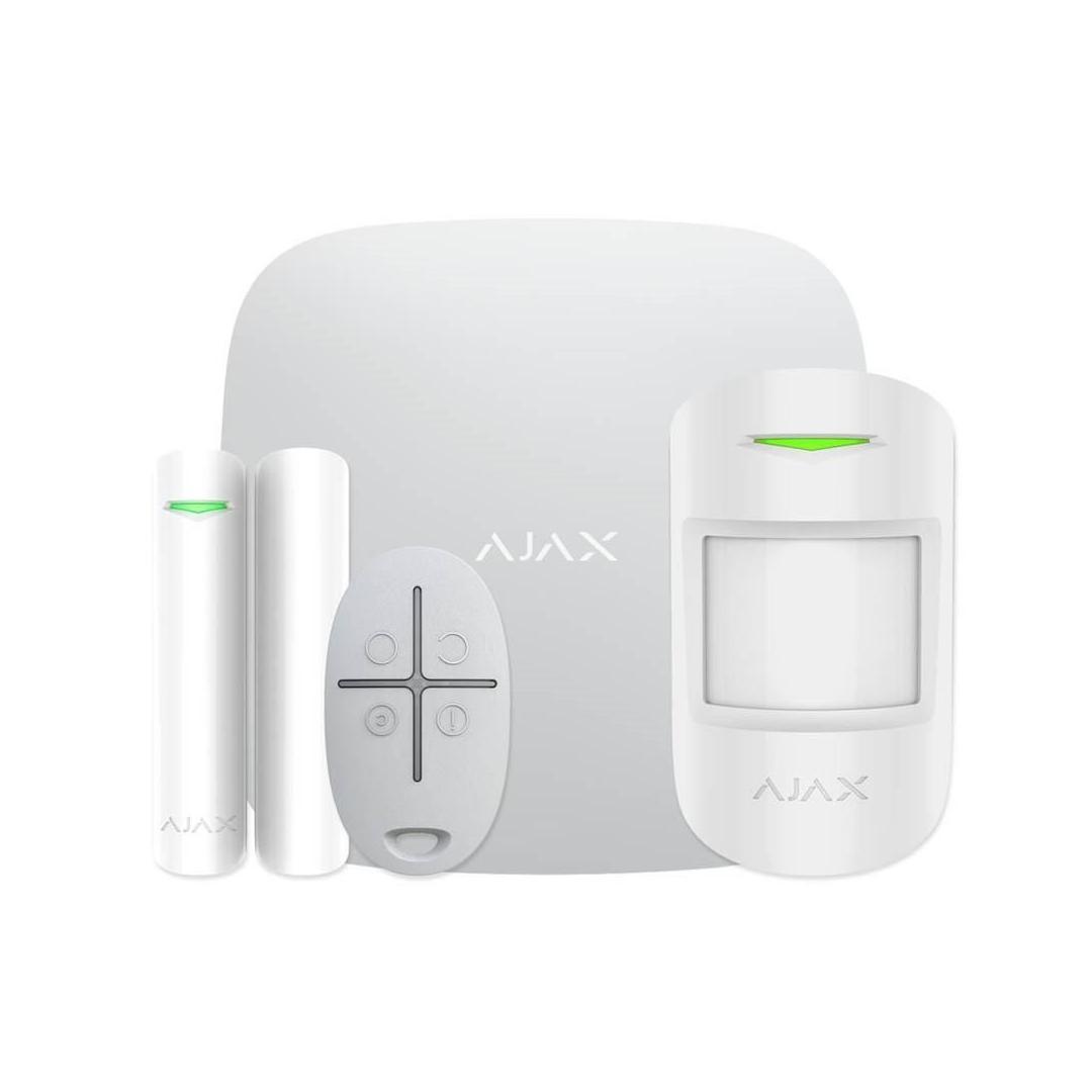 Väri Valkoinen Ajax-turvajärjestelmän aloituspaketti. Pakkaus koostuu keskuksesta, liiketunnistimesta, avautumisilmaisimesta ja paniikkipainikkeella varustetusta avaimenperästä.