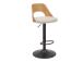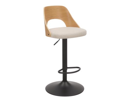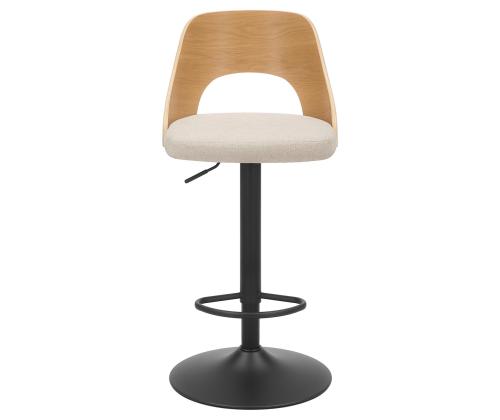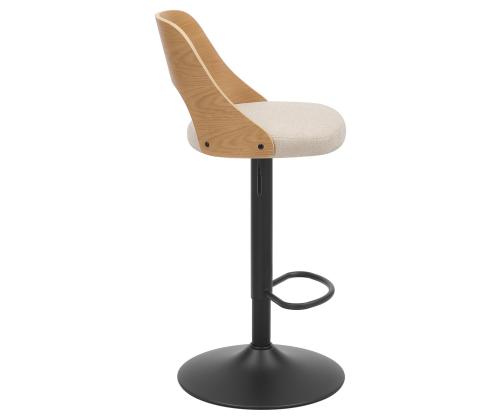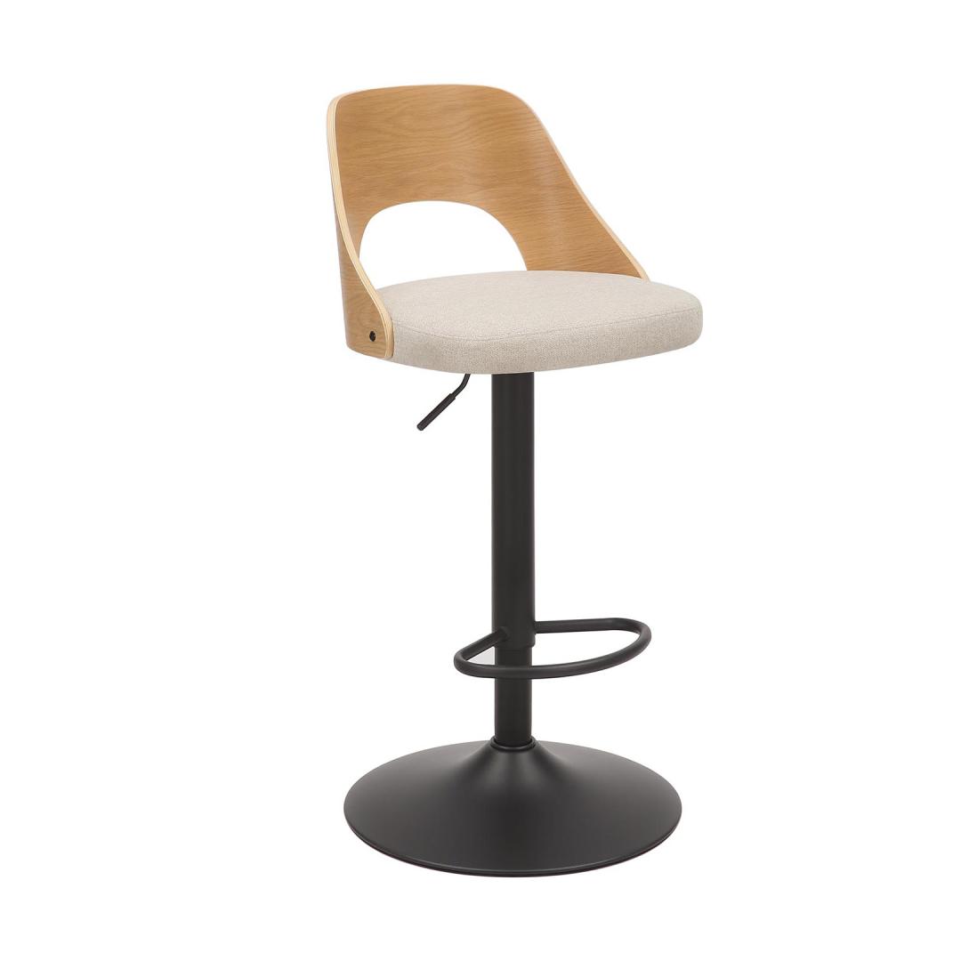 This height-adjustable bar stool fuses contemporary feel with classic Scandinavian aesthetics. It has a rounded, open back in a lacquered oak veneer and chenille-covered seat pad. The stool proves that beauty lies in the details. Supported by a black trumpet base with footrest, it includes a swivel function for easy movement and comfort. The base is made of black rough powder coated steel. Gas lift enables seating height adjustment from 62–84cm. The dimensions are 47x50,5xH113cm.