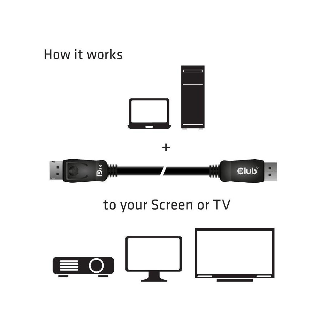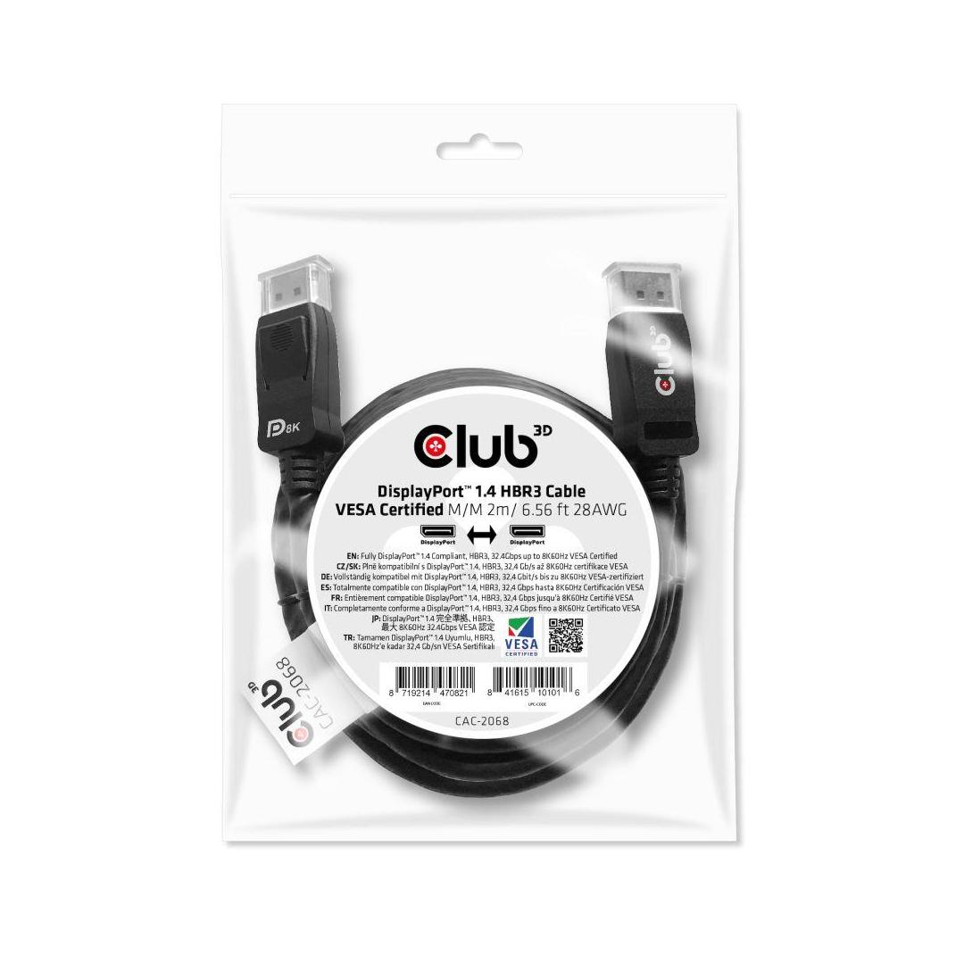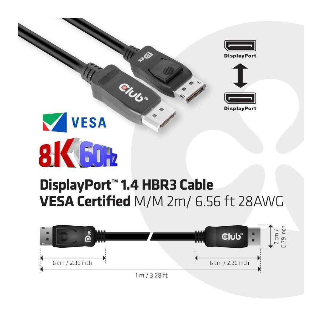 The Club 3D CAC-2068 DisplayPort™ 1.4 HBR3 VESA Certified Cable enables the connection of your DisplayPort™ supported (Gaming) PC or Laptop to an (Ultra) High Resolution Monitor or other DisplayPort™ supported device to Support resolutions up to 8K60Hz. DisplayPort™ 1.4 adds support for Display Stream Compression 1.2 (DSC), Forward Error Correction, and extends the maximum number of inline audio channels to 32. It features locking DisplayPort™ connectors providing a secure, dependable connection. Simply press the built-in one-touch latch button to unlock the connector. The soft UltraFlex jacket protects the cable from bends and deformation damage.
