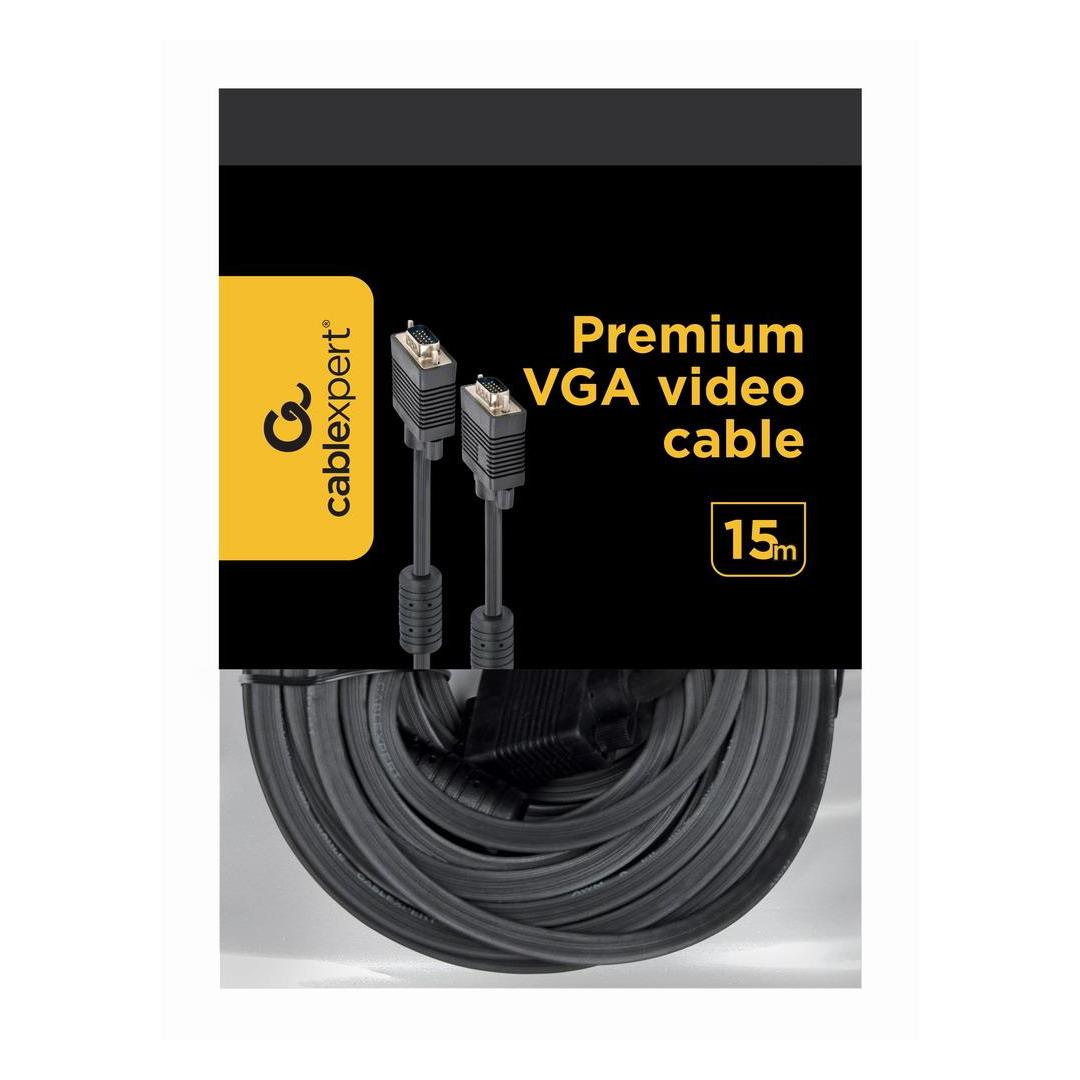 Gembird CC-PPVGA-15M-B. Cable length: 15 m, Connector 1: VGA (D-Sub), Connector 2: VGA (D-Sub). Compliance certificates: RoHS. Quantity per pack: 1 pc(s), Package width: 200 mm, Package depth: 200 mm