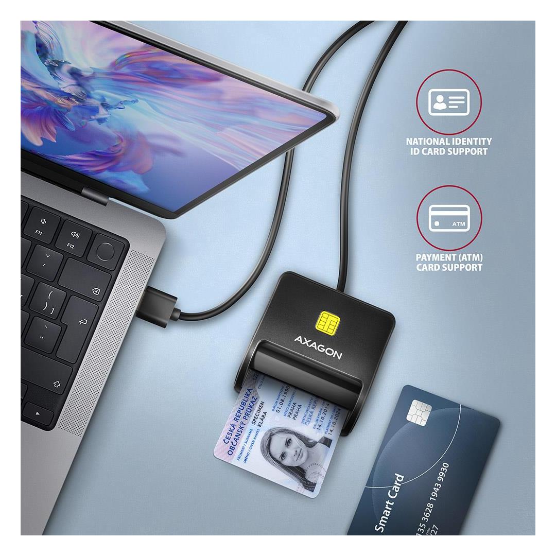 Kompakti työpöydän älykortin / henkilökortin lukija AXAGON CRE-SM3SD FlatReader USB 2.0 -liitännällä sisältää lisäpaikat SD-, microSD- ja SIM-kortteja varten. Kortinlukija tukee kaikkia yleisimpiä kontaktiaikaisia älykorttiformaatteja, sirukortteja ja muita kortteja, mukaan lukien kontaktiaikaiset pankkimaksukortit tai kontaktiaikaiset sähköiset henkilökortit *. Lukija on yhteensopiva useimpien kansallisten eID-sovellusten (sähköiset henkilökortit) kanssa.