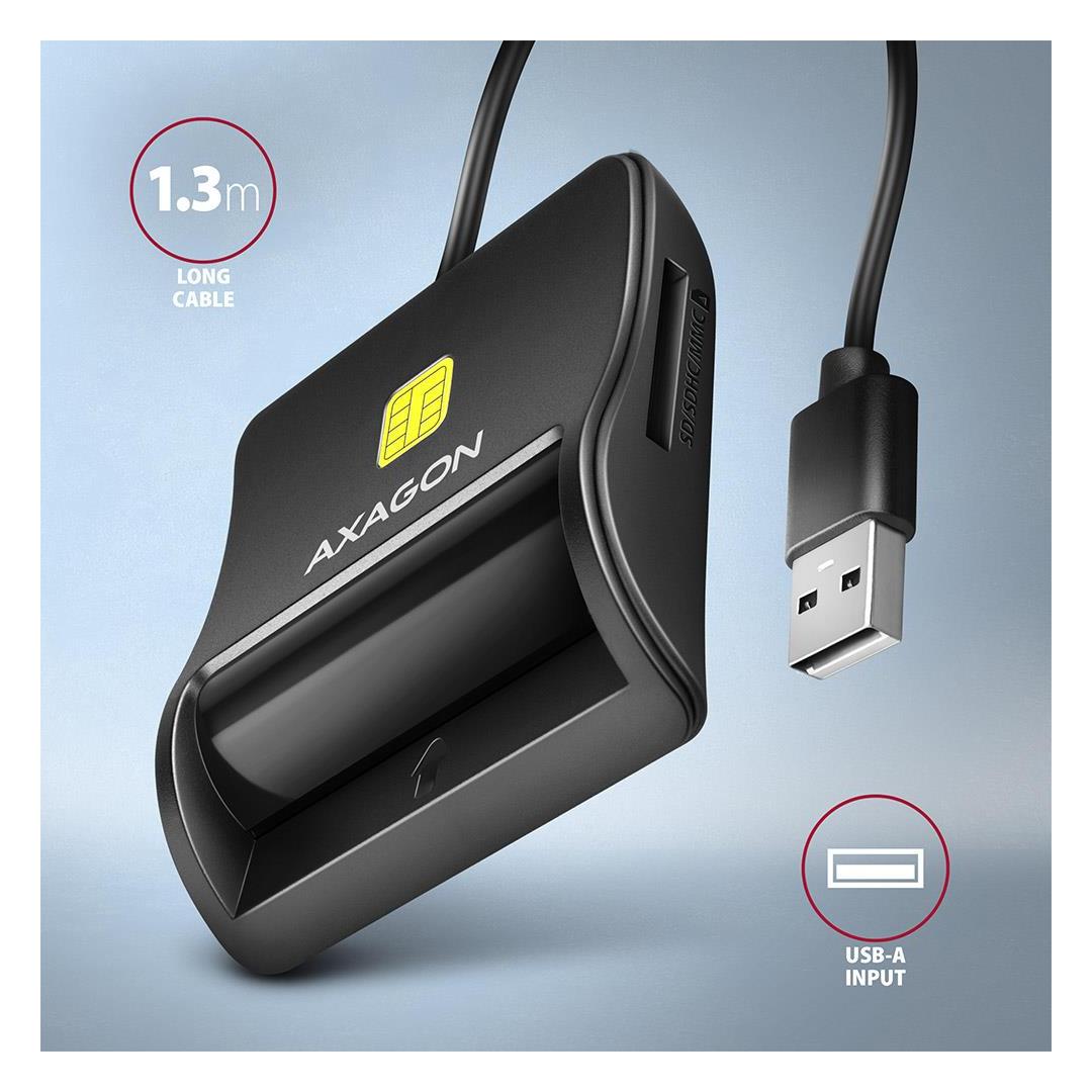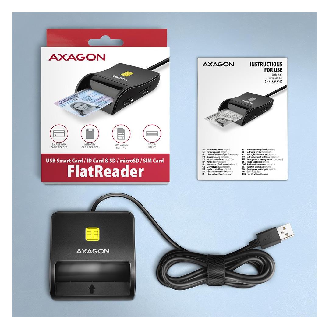 Axagon CRE-SM3SD USB Smart card & SD/microSD/SIM Flat. Interface: USB 2.0. Cable length: 1.3 m, Product colour: Black. Weight: 60 g