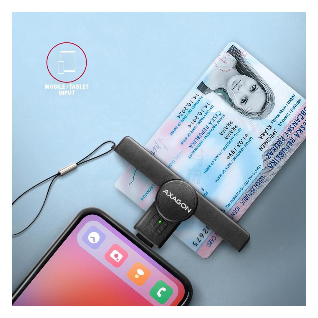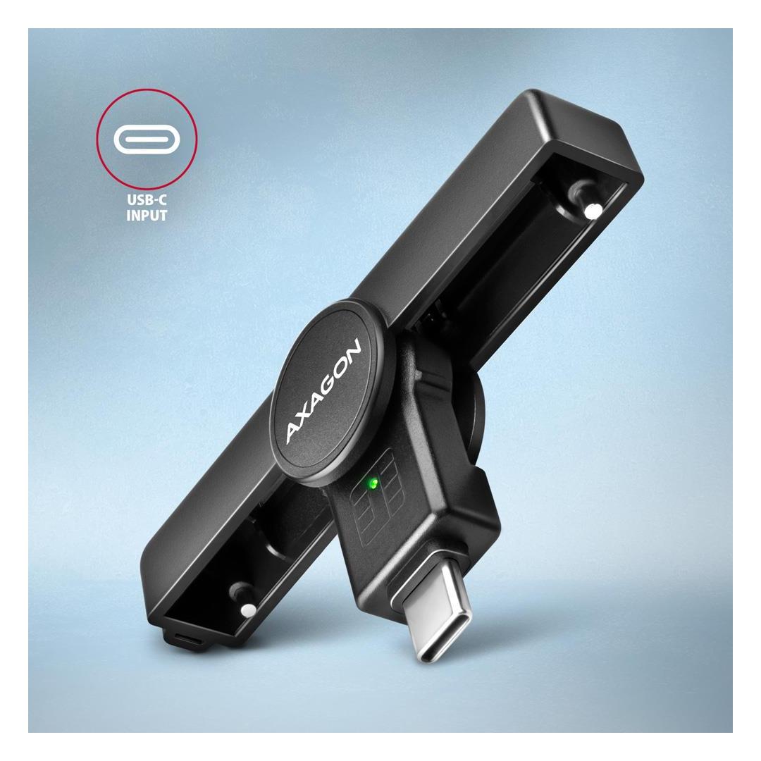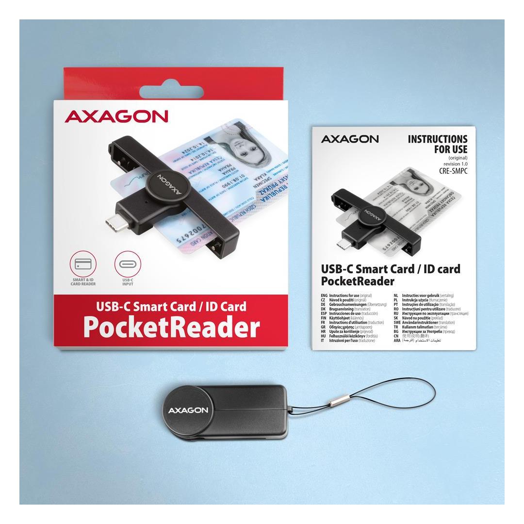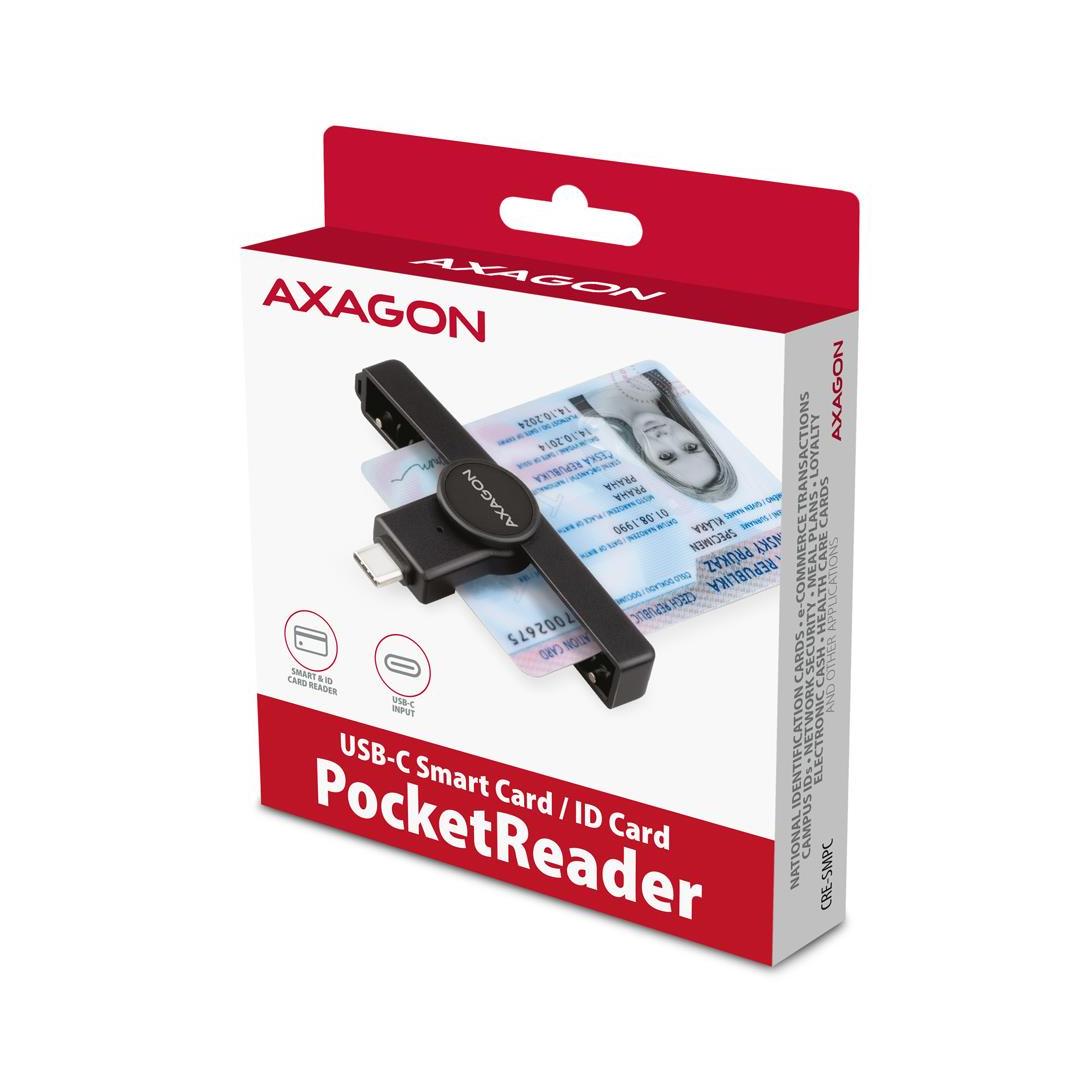 Axagon CRE-SMPC USB-C Smart card/ID card PocketReader. Interface: USB Type-C. Product colour: Black. Weight: 9 g