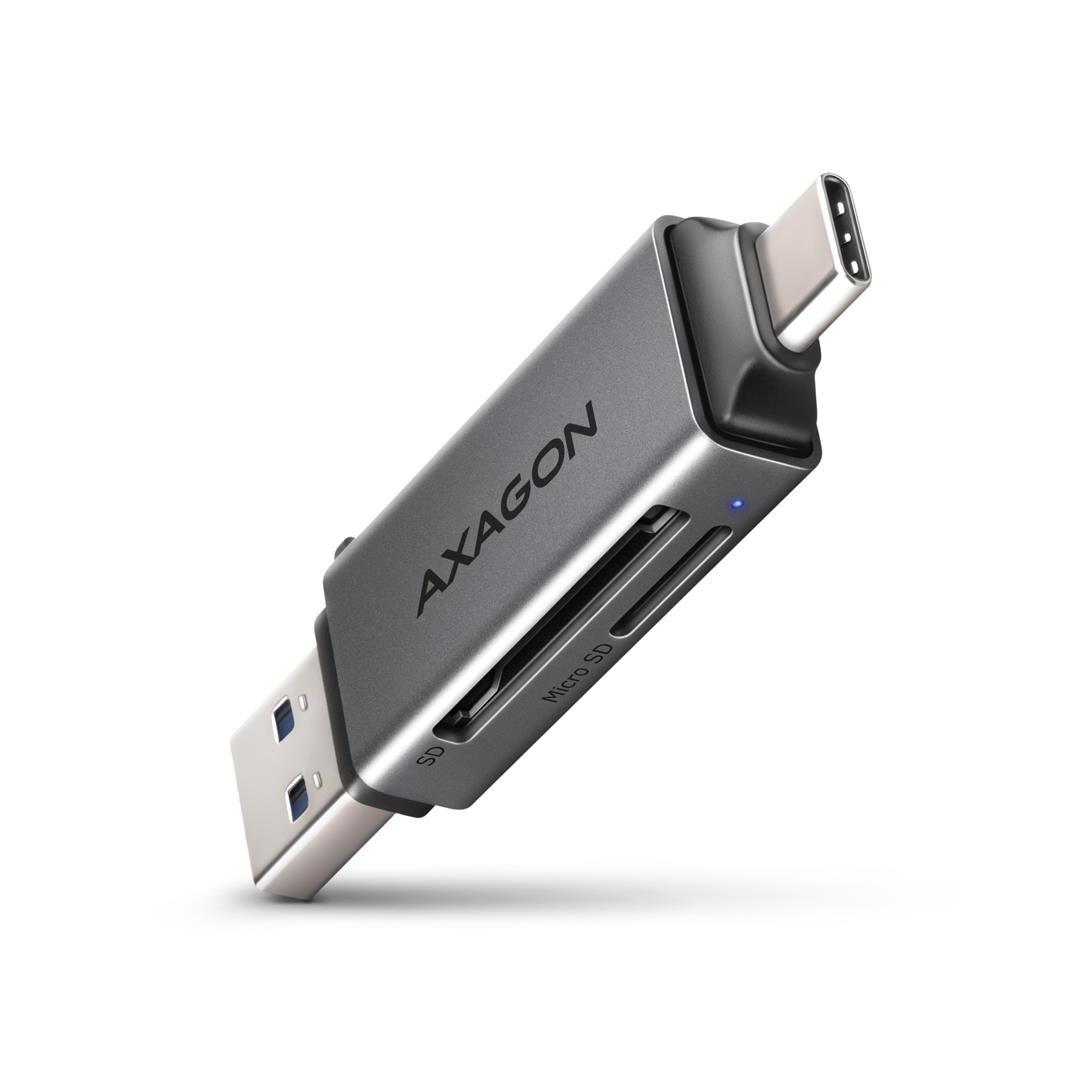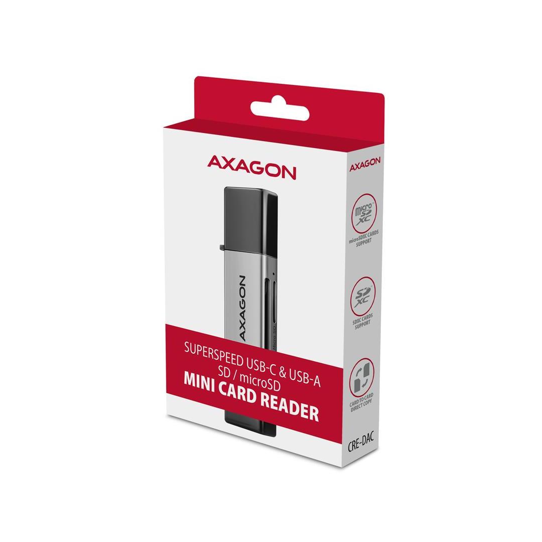 Mobiili Mini-muistikortinlukija AXAGON CRE-DAC, jossa on USB 5 Gbps -liitäntä, tukee kaikkia SD- ja microSD-korttien nykyisiä versioita, mukaan lukien SDXC- ja microSDXC-kortit, joiden kapasiteetti on jopa 2 Tt.