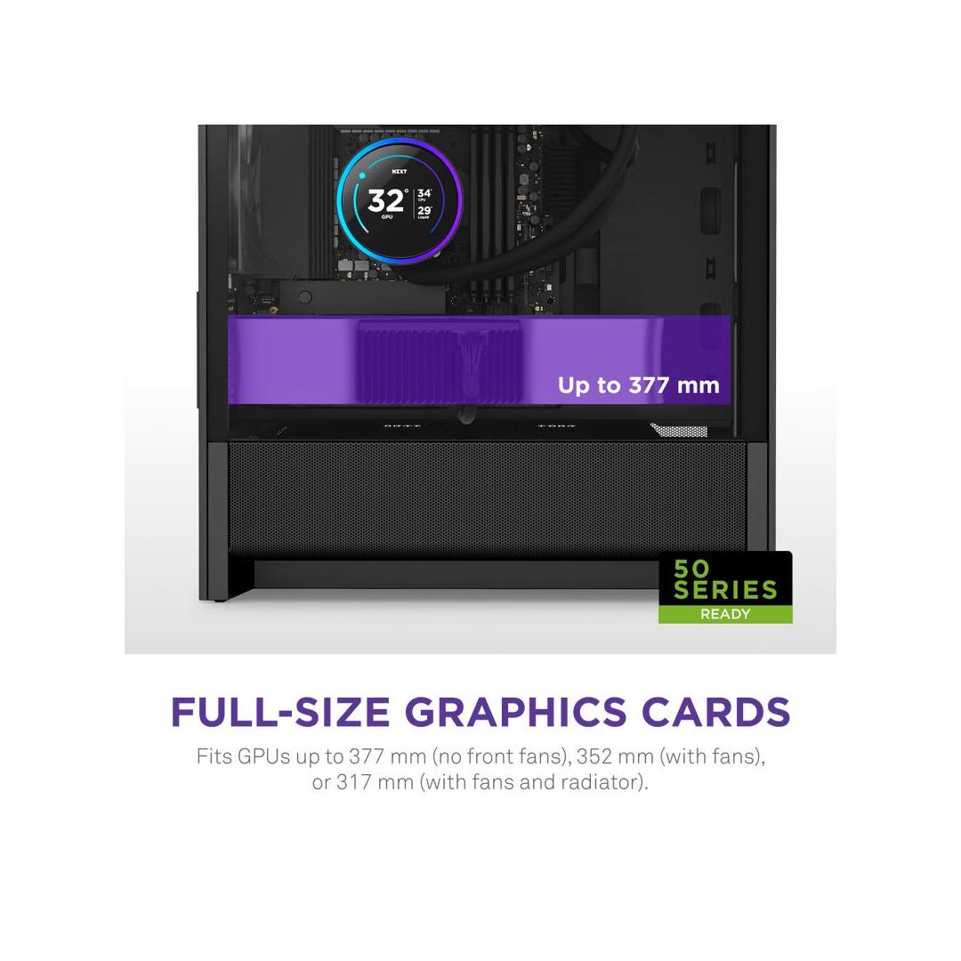 - Täysikokoisen näytönohjaimen tuki: Sopii enintään 377 mm:n näytönohjaimille (ilman etutuulettimia), 352 mm:n näytönohjaimille (etutuulettimien kanssa) tai 317 mm:n näytönohjaimille (etupatterin ja tuulettimien kanssa).