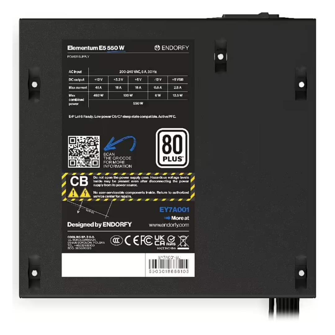 Elementum E5 550 W on 80 PLUS®-sertifikaatilla varustettu vakaa virtalähde, joka sopii hyvin sekä PC-integraattoreille että kotikokoonpanoon. Se on varustettu asianmukaisella johdotuksella näytönohjaimen virransyöttöä varten kahdella PCI-E-liitännällään (8- ja 6-pinninen). Ja syvän mustan värisävynsä ansiosta se näyttää houkuttelevalta myös vähemmän visuaalisesti vaikuttavissa tietokoneissa.