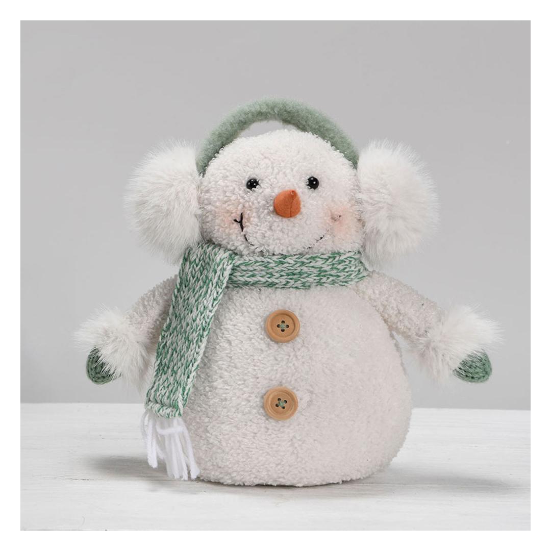 Mitat: 20x12xH26cm Koriste FUN EKE, lumiukko kirkkaan vihreällä huivilla.