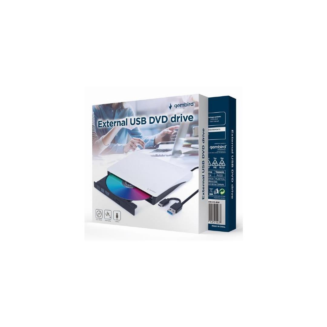 Gembird DVD-USB-031-BW. Product colour: Black, Disc loading type: Front, Certification: CE. Purpose: Desktop, Optical drive type: DVD±RW, Interface: USB Type-C. DVD+R write speed: 8x, CD-R write speed: 24x, DVD-R write speed: 8x. CD-ROM read speed: 24x, DVD-ROM read speed: 8x. Width: 140 mm, Depth: 140 mm, Height: 18 mm
