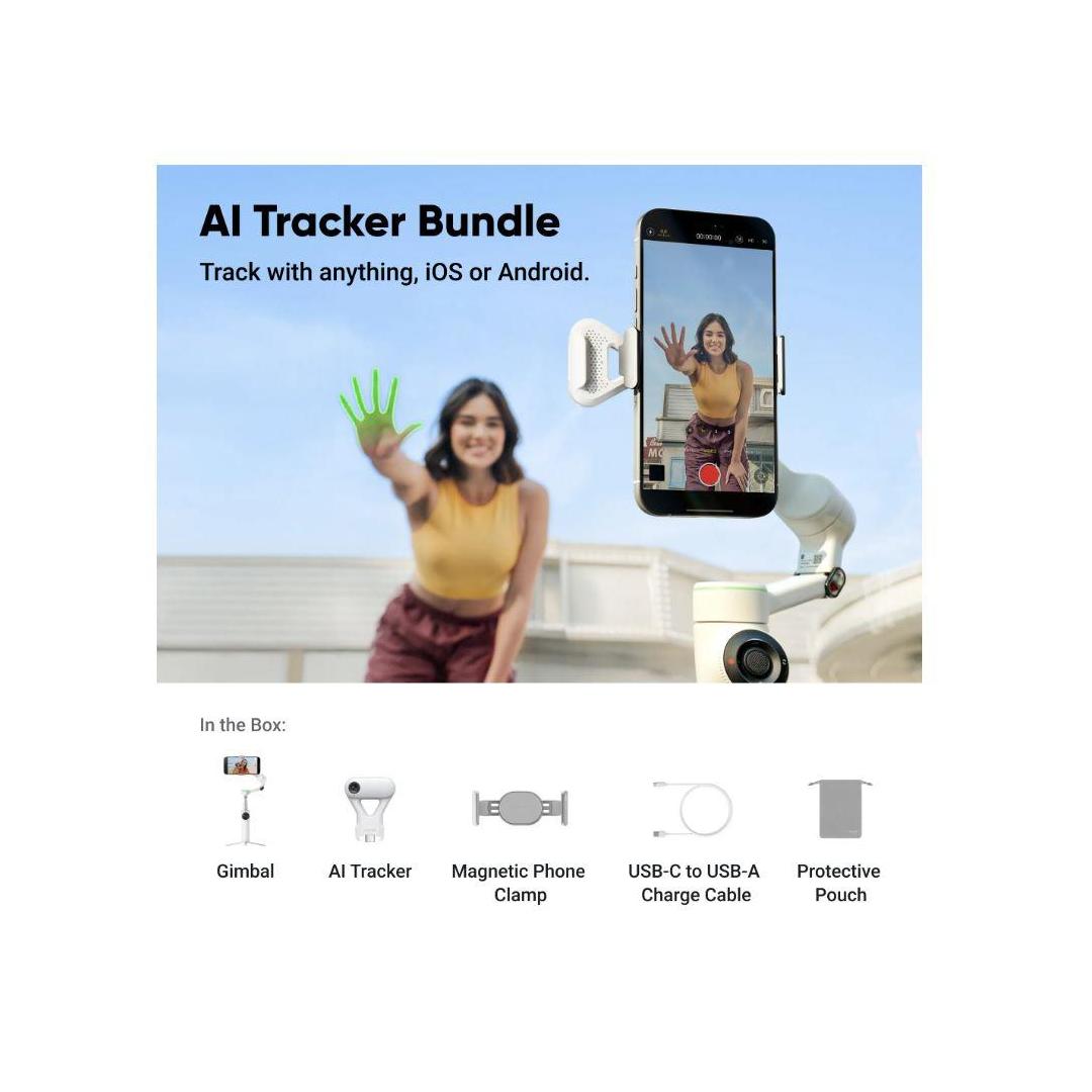 - Ei rajoituksia puhelinmalleille tai sovelluksille. Sisältää 1x Insta360 Flow 2 Pro, 1x AI Tracker, 1x magneettinen puhelinkiinnike, 1x USB-C-USB-A-latauskaapeli ja 1x suojapussi.