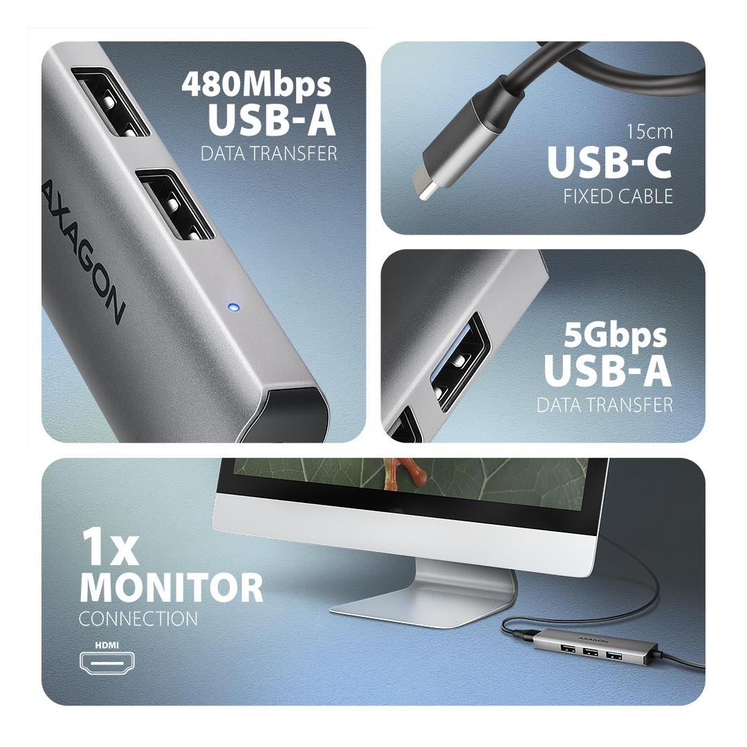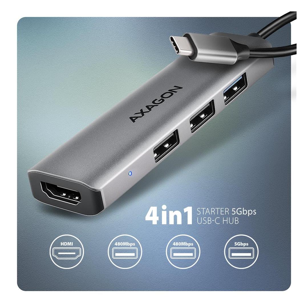 - Moniporttinen USB-C 5Gbps AXAGON HMC-H3A STARTER 4in1 -keskitin laajentaa kannettavaa tietokonettasi, tietokonettasi tai puhelintasi neljällä portilla. Kytke kannettava tietokone keskittimeen 15 cm:n pituisella USB-C-kaapelilla. Sinulla on heti liitännät, joilla voit liittää monitorin ja kolme USB-laitetta samanaikaisesti.