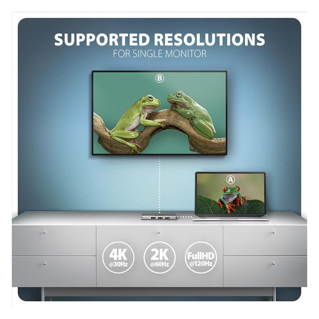 - 1 näyttö - jopa 4K/30Hz Ultra HD, 2K/60Hz Quad HD, 1080p/120Hz Full HD.