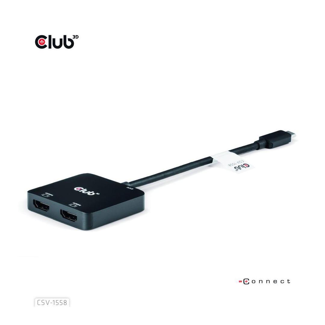 Club 3D CSV-1558 USB Type-C to Dual HDMI™ 4K60Hz + PD 100 Watt Lataus DP1.4 Alt -tilassa, joka mahdollistaa isännän USB Type-C-portin laajentamisen 2x HDMI™-näyttöön ultrakorkealla teräväpiirtotarkkuudella max 4K60Hz kummallekin näytölle samanaikaisesti. Tukemalla MST-toimintoa, kaksoisnäyttöjä voidaan näyttää samanaikaisesti eri videosisältöjä. Lisäksi se tukee PD-latausta maksimissaan 100 watin teholla. Se voi toimia kaikissa DP™ Alt -tilaa tukevissa USB Type-C- tai Thunderbolt™-laitteissa (mukaan lukien puhelimet, joissa on USB Type-C -liitäntä ja DP™ Alt -tilatuki).