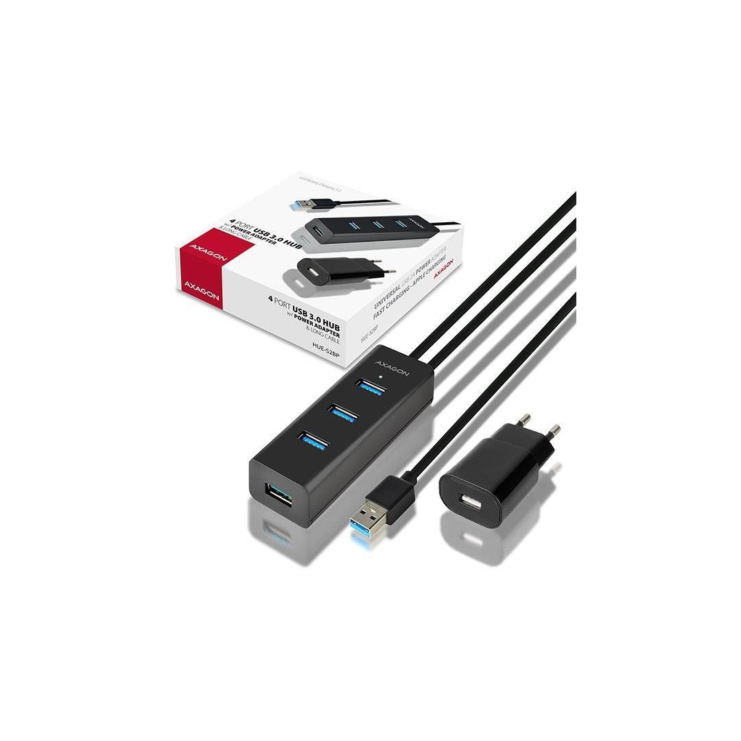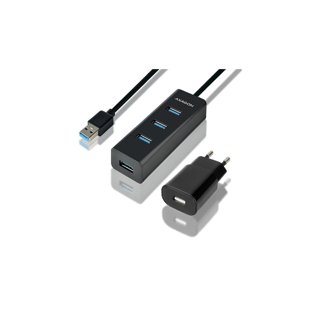 Neljäporttinen AXAGON HUE-S2BP USB 3.0 -keskitin, jossa on 1,2 m pitkä USB-kaapeli, virtalähde ja pikalataustuki kaikissa porteissa.