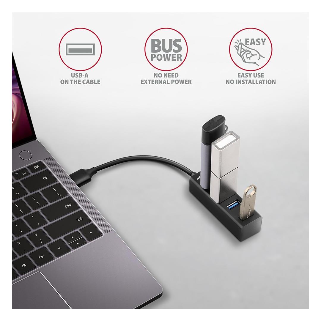 Pienikokoinen metallinen USB 3.2 Gen 1 (USB 3.0) -keskitin AXAGON HUE-M1A yhdistää nopeasti ja helposti jopa neljä USB-laitetta kannettavaan tietokoneeseen tai tietokoneeseen.
