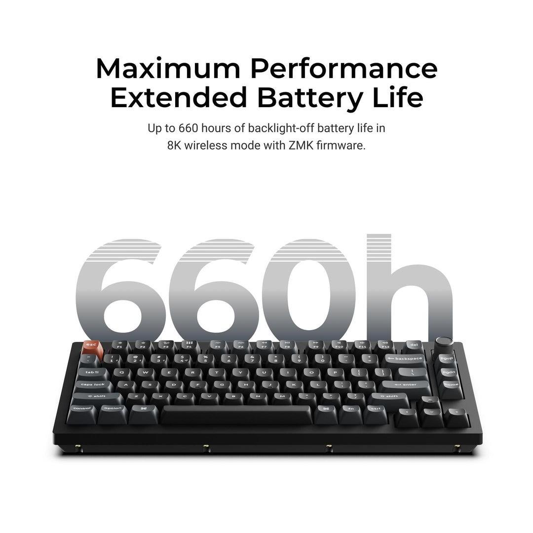 Keychron V1 Ultra 8K. Keyboard form factor: 75%. Keyboard style: Straight. Connectivity technology: Wired & Wireless, Device interface: Bluetooth, Keyboard key switch: Mechanical, Keyboard layout: QWERTY. Backlight type: RGB LED. Recommended usage: Universal. Product colour: Black