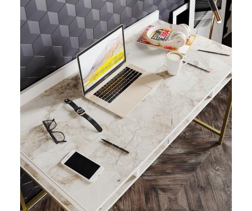 Luo ylellinen opiskeluhuone lumoavalla opiskelupöydällämmeMuuta opiskeluhuoneesi lumoavaksi työpajaksi upealla opiskelupöydällämme. Tämä äärimmäisen tarkasti ja yksityiskohtiin paneutuen valmistettu työpöytä on suunniteltu kaunistamaan työtilaasi ja lisäämään tuottavuutta. Koe vertaansa vailla oleva tyylikkyys ja kestävyysPöytämme on valmistettu 100-prosenttisesti melamiinipinnoitetusta lastulevystä, joka takaa poikkeuksellisen kestävyyden ja pitkäikäisyyden. paksuus 18 mm takaa vahvan ja luotettavan pinnan, joka kestää aikaa. Tyylikkäät metallijalat eivät ainoastaan lisää tyylikkyyttä, vaan takaavat myös erinomaisen vakauden kaikkiin opiskelutarpeisiisi.Runsaasti tilaa organisointiin ja säilytykseenPöytäsi 120 cm leveä, 75 cm korkea ja 60 cm syvä tarjoaa runsaasti tilaa kaikille opiskelutarvikkeillesi. Työpöydän alla oleva 12 cm korkea hylly tarjoaa lisätilaa kirjoille, paperitarvikkeille ja muille tavaroille ja pitää työtilasi siistinä ja järjestyksessä. Esteettistä vetovoimaa, joka ylittää rajat Työpöytämme on suunniteltu loistokkaalla konseptilla, joka on saanut inspiraationsa hotellien sisustuksen eleganssista. Kullan ja valkoisen yhdistelmä lisää ylellisyyttä ja hienostuneisuutta mihin tahansa työtilaan, mikä tekee siitä erottuvan kappaleen, joka tekee vaikutuksen sekä sinuun että vieraisiin. Tekniset tiedot: Tuotetyyppi: Tuotetyyppi: TyöpöytäMateriaali: Materiaali: MetalliLeveys: 120 cmKorkeus: 75 cmSyvyys: 60 cmHyllyn alla olevan hyllyn korkeus: 12 cmLisäsäilytystilaa: Värit: Värit: kulta ja valkoinen Väri: Kullanvalkoinen