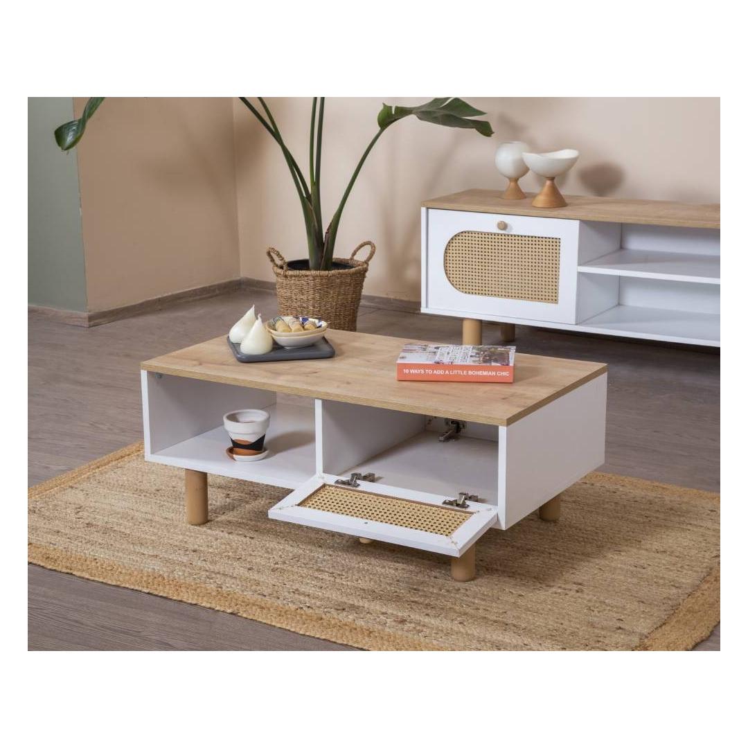Muunna asuintilasi kauniilla sohvapöydällämme, joka on valmistettu hienoimmista materiaaleista ja tuo kotiisi sekä tyyliä että toiminnallisuutta. sohvapöytä on valmistettu 100-prosenttisesti melamiinipinnoitetusta lastulevystä, joten se on kestävä ja helppo puhdistaa, mikä takaa, että se pysyy olennaisena osana kotiasi tulevina vuosina. Tyylikkäät saranoidut puujalat ja kahvat lisäävät muotoiluun hienostuneisuutta, joten se on täydellinen lisä mihin tahansa nykyaikaiseen tai perinteiseen sisustukseen.Maksimoi tilasi lisäsäilytystilallaHyvästele sotkuiset olohuoneet sohvapöydällämme, jossa on ylimääräistä säilytystilaa. Pidä aikakauslehdet, kaukosäätimet ja muut välttämättömät tavarat siististi piilossa pehmeästi sulkeutuvien ovien ansiosta, jotka tarjoavat helpon pääsyn ja säilyttävät samalla tyylikkään ulkonäön.Ajatonta eleganssia valkoisessa ja tammessaValkoisen ja tammen värien yhdistelmä antaa tälle sohvapöydälle ajattoman viehätyksen, joka sulautuu vaivattomasti mihin tahansa kodin värimaailmaan. Piditpä sitten minimalistisesta estetiikasta tai viihtyisästä, rustiikkisesta ilmapiiristä, tämä monipuolinen esine täydentää tyyliäsi kauniisti.Paranna olohuoneesi sohvapöydällä jo tänään ja koe tyylin ja toiminnallisuuden täydellinen yhdistelmä.Tekniset tiedot:Materiaali:100 % melamiinipinnoitettu lastulevyJalat ja kahvat:MassiivipuutaMitat:Leveys 100 cm, korkeus 45 cm, syvyys 45 cmLisävarasto:KylläPehmeästi sulkeutuvat ovet:KylläVäri:Valkoinen ja tammi Väri: Valkoinen tammi