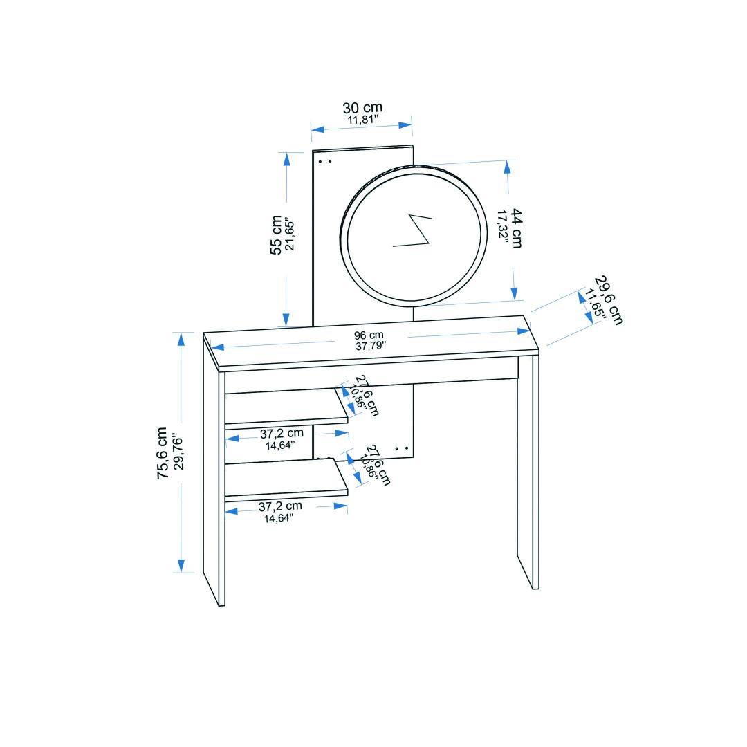 Vaihda aamurutiinejasi kauniilla meikkitauluillamme Sapphire ja White -väreissä. Tämä tyylikäs kappale ei ainoastaan kohota makuuhuoneesi tai pukeutumisalueesi ilmettä, vaan tekee myös jokapäiväisestä valmistautumisesta ylellisen kokemuksen. Sarjaan sisältyvä halkaisijaltaan 44 cm:n peili auttaa sinua saavuttamaan täydellisen ilmeen helposti, ja 18 mm:n paksuinen 100-prosenttisesti melamiinipinnoitettu lastulevy takaa kestävyyden ja pitkäikäisyyden.Korosta tilojasiLisää tiloihisi hiukan hienostuneisuutta meikkitauluillamme Sapphire ja White. Tyylikäs muotoilu ja laadukkaat materiaalit tekevät tästä pakollisen hankinnan kaikille kauneutta ja tyyliä rakastaville.Vaivaton kauneusrutiiniValmistautuminen aamulla on helppoa mukana tulevan peilin avulla. Peilin täydellinen koko ja kulma auttavat sinua saavuttamaan virheettömän meikkilookin joka kerta.Kestävä ja pitkäikäinenTämä meikkipöytä on valmistettu 100-prosenttisesti melamiinipinnoitetusta lastulevystä, joten se on tehty kestämään. paksuus 18 mm takaa vakauden ja kestävyyden vuosiksi eteenpäin.Tekniset tiedot:Materiaali:100 % melamiinipinnoitettu lastulevyPaksuus:18 mmKoko:Leveys:96 cm,Korkeus:130 cm,Syvyys:29.6 cm.Hyllyn koko:Halkaisija:44 cmVäri:Sapphire ja valkoinen Väri: Sapphire White