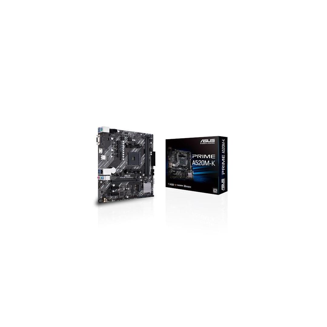 ASUS PRIME A520M-K. Processor manufacturer: AMD, Processor socket: Socket AM4, Compatible processor series: AMD Ryzen™ 3, AMD Ryzen™ 5, AMD Ryzen™ 7. Supported memory types: DDR4-SDRAM, Maximum internal memory: 64 GB, Memory slots type: DIMM. Supported storage drive interfaces: M.2, SATA III, Supported storage drive types: HDD & SSD, RAID levels: 0, 1, 10. USB connector type: USB Type-A. Ethernet interface type: Gigabit Ethernet, LAN controller: Realtek RTL8111H