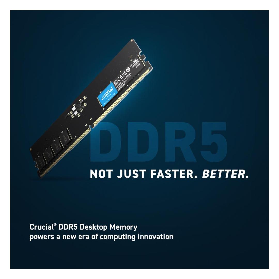 Crucial DDR5 Desktop -muistilla voit siirtää tietokoneellesi 50 % enemmän dataa kuin DDR4-muistilla käynnistyshetkellä, mikä nopeuttaa latausaikoja, tiedostojen siirtoja, latauksia, virkistystaajuuksia ja vähentää viiveaikaa. Suuremman väylätehokkuuden ansiosta DDR5-teknologia ei ole vain nopeampi kuin edellinen sukupolvi, vaan se on parempi.