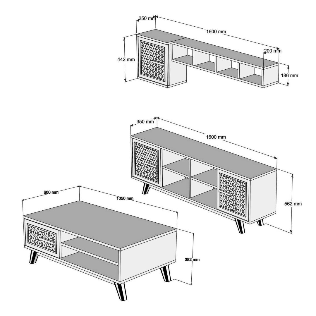 - TV Unit Size: Width: 160 cm, Height: 56.2 cm, Depth: 35 cm