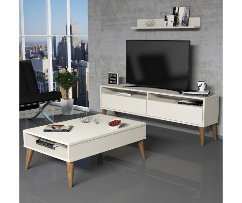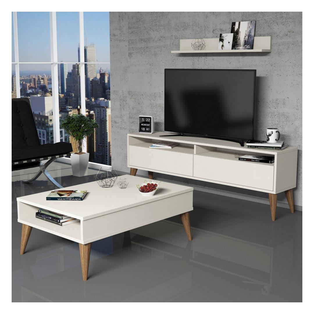 Featuring a TV stand, wall shelf, and coffee table, this set offers ample storage and display options. The numerous shelves provide a convenient space to showcase your favorite books, decor items, and family photos. With the option to fix it to the wall, you can optimize your space and create a clutter-free environment.