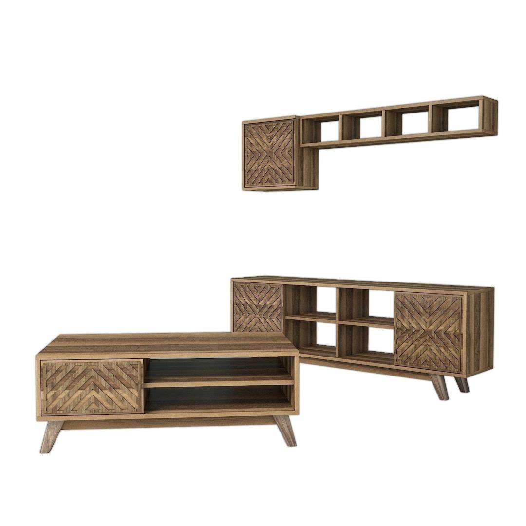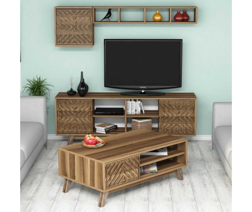 Our furniture set includes a TV unit, wall shelf, cabinet, and coffee table, providing ample storage space for all your living room essentials. The numerous shelves allow you to neatly organize your belongings, keeping your living room clutter-free.