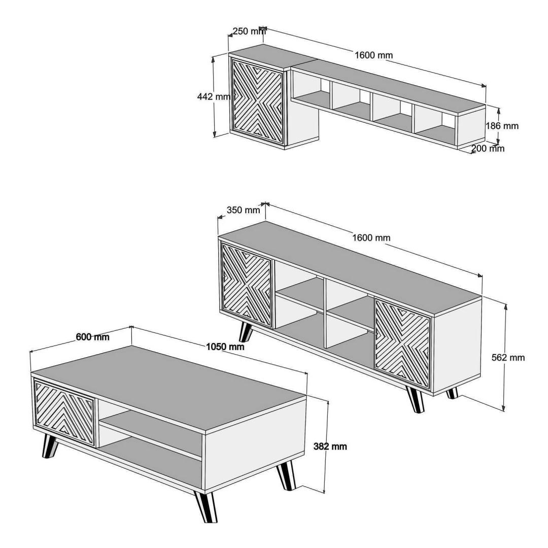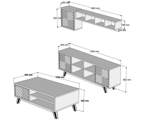 - TV Unit Size: Width: 160 cm, Height: 56.2 cm, Depth: 35 cm
