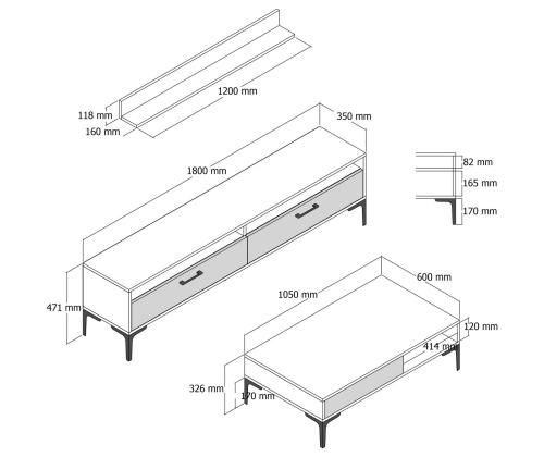 - TV Stand: Width: 180 cm, Height: 47 cm, Depth: 35 cm