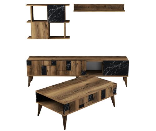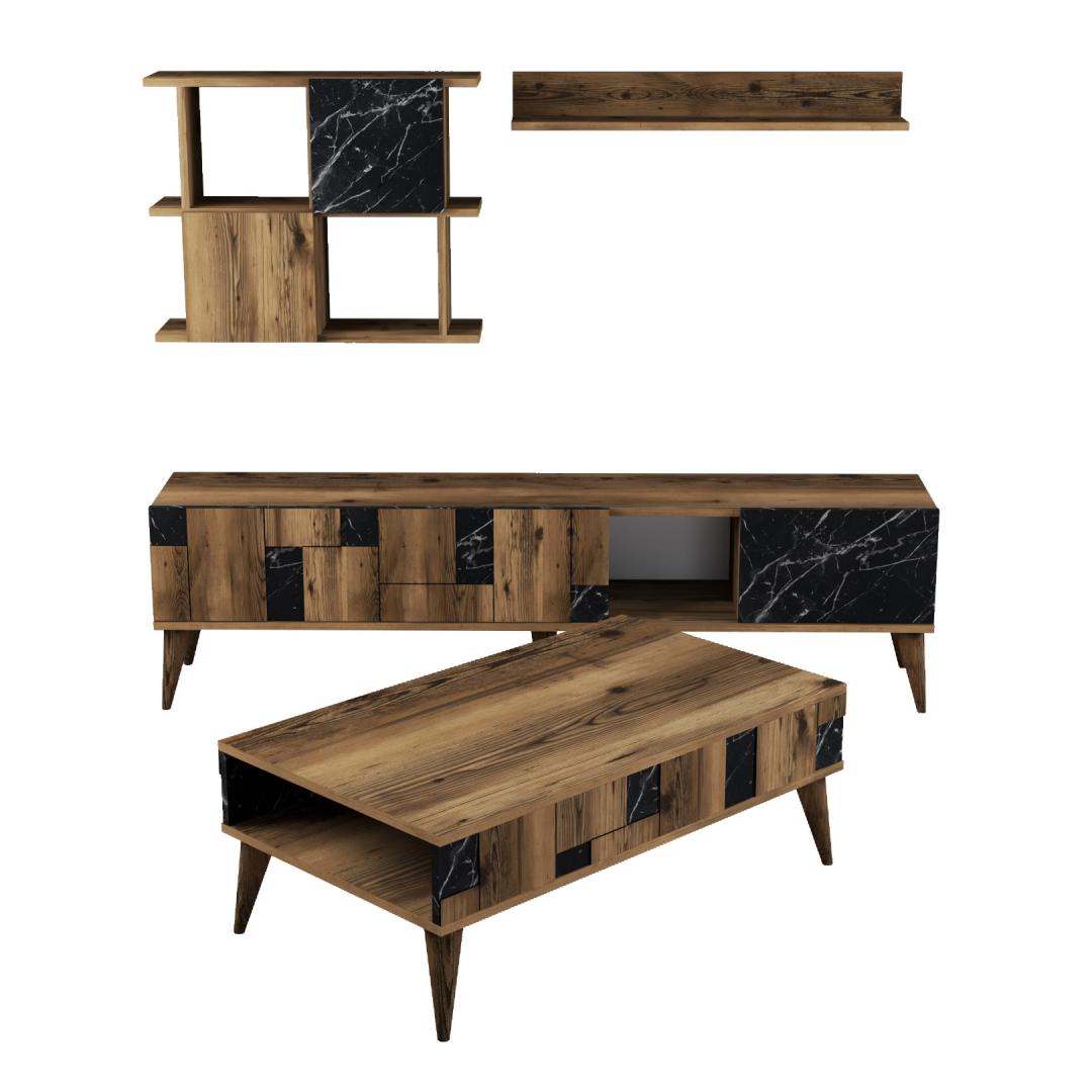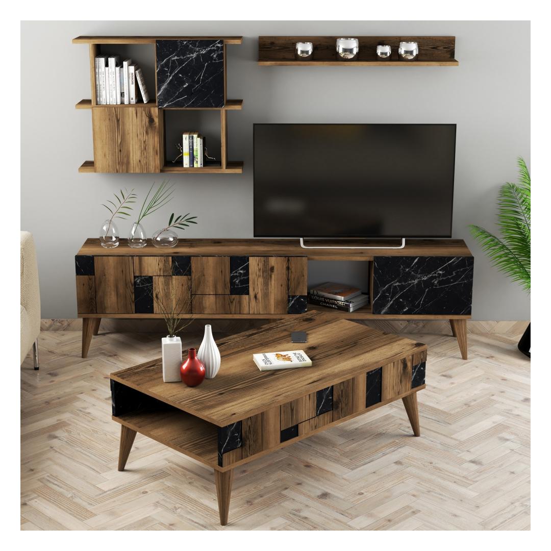 The TV unit, cabinet, wall shelf, and coffee table included in this set offer ample storage space to keep your living room organized and clutter-free. The numerous shelves provide convenient storage for your books, decor, and entertainment essentials.