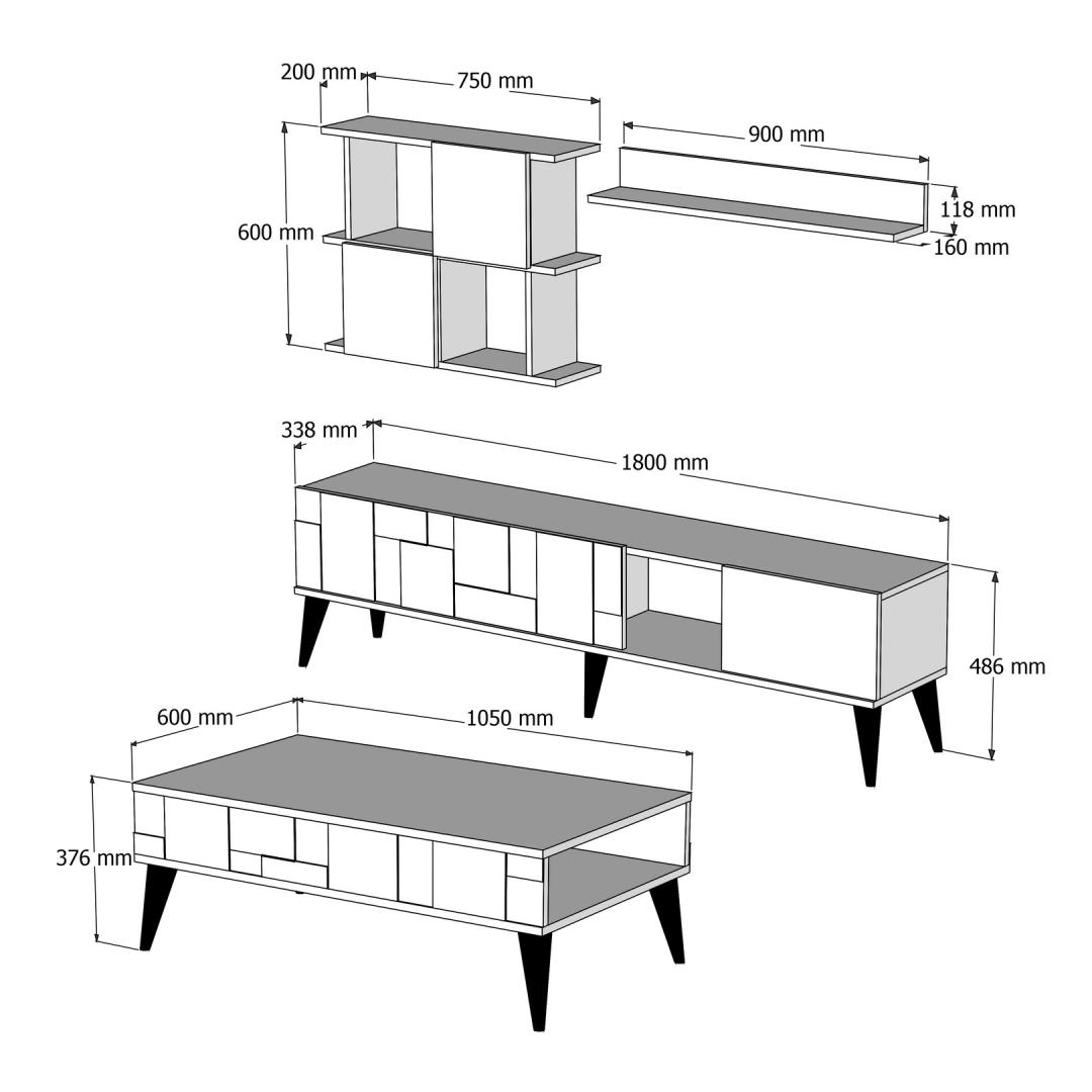 - TV Unit Size: Width: 180 cm, Height: 48.6 cm, Depth: 33.8 cm