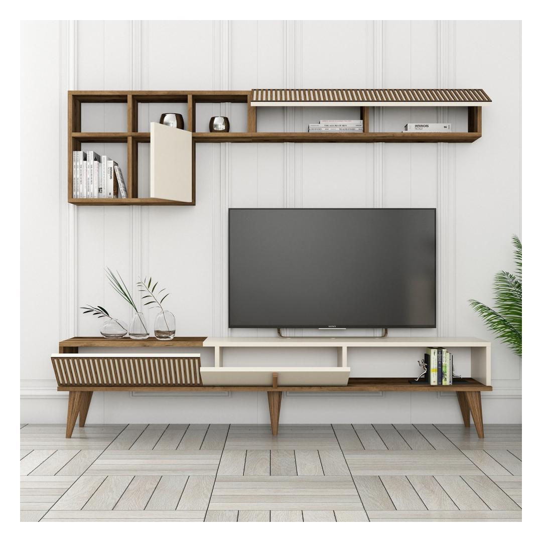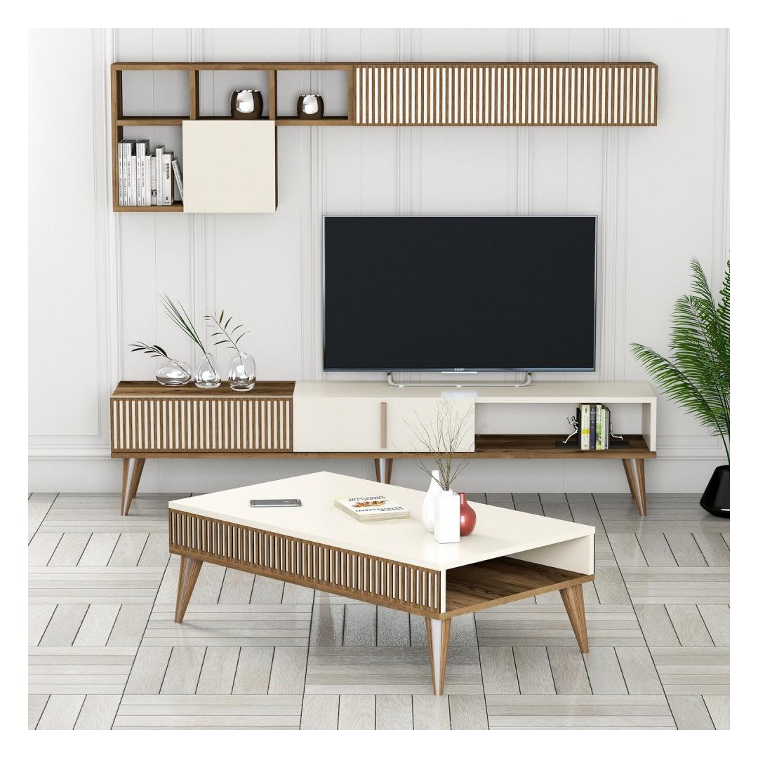 Muuda oma elutuba mugavuse ja stiili paradiisiks meie suurepärase elutoa mööblikomplektiga. See komplekt on valmistatud ülima hoole ja tähelepanuga detailidele ning on mõeldud teie ruumi kaunistamiseks ja sooja ning kutsuva atmosfääri loomiseks. Päratu elegantsusSee mööblikomplekt oma elegantse disaini ning pähklipuu- ja kreemi värvi keerulise kombinatsiooniga õhkab ajatut elegantsi. See sulandub vaevata mis tahes sisustusstiiliga, lisades teie elutuppa klassikalisust.Võrratu vastupidavusSee mööblikomplekt on valmistatud 100% melamiiniga kaetud puitlaastplaadist, mis on loodud kestma. 18 mm paksus tagab vastupidavuse ja vastupidavuse, mis teeb sellest usaldusväärse investeeringu aastateks. Rikkalik panipaikÜtle hüvasti segastele ruumidele! meie elutoa mööblikomplektil on arvukalt riiuleid, mis pakuvad piisavalt ruumi raamatute, sisustusesemete ja muu jaoks. Hoidke oma elutuba organiseeritud ja korras, esitledes samal ajal oma isiklikku stiili. Täiuslikus proportsioonisTeleripult, seinariiul ja kohvilaud on hoolikalt disainitud, et need sobiksid sujuvalt teie elutuppa. Teleri statiivi laius on 180 cm, kõrgus 40 cm ja sügavus 35 cm, seinariiuli laius on 180 cm, kõrgus 48 cm ja sügavus 35 cm. 6cm kõrgusega ja 20cm sügavusega. Kohvilaud on 105cm lai, 34. 6cm kõrgusel ja 60cm sügavusel. Kerge kokkupanekMeie elutoa mööblikomplektil on stabiilsuse lisamiseks plastmassist jalad ja jalgade kõrgus on 20cm. Lihtsalt järgitavad juhised tagavad probleemivaba kokkupaneku, mis võimaldab teil oma uut mööblit kiiresti nautida. Elustage oma elutuba meie elutoa mööblikomplektiga. Kogege täiuslikku segu stiilist, funktsionaalsusest ja vastupidavusest. Tellige kohe ja looge ruum, mis peegeldab tõeliselt teie isikupära. Värv: Walnut Cream
