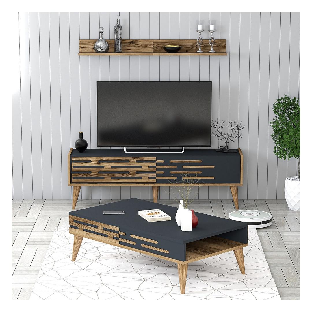Muuda oma elutuba mugavuse ja stiili paradiisiks meie suurepärase elutoa mööblikomplektiga. See komplekt on valmistatud ülima hoole ja tähelepanelikkusega, et tõsta teie ruumi ning luua soe ja kutsuv atmosfäär teile ja teie lähedastele. Võrratu elegants ja vastupidavusMeie mööblikomplekt on valmistatud 100% melamiiniga kaetud puitlaastplaadist, mis tagab erakordse vastupidavuse ja pikaealisuse. 18 mm paksus tagab vastupidavuse, mis võimaldab teil nautida selle ilu aastaid.Täiuslikus suuruses teie mugavuse tagamiseksTeleri statiiv, mille mõõtmed on 140 cm laius, 35 cm kõrgus ja 45 cm sügavus, pakub piisavalt ruumi teie televiisorile ja teistele meediaseadmetele. Seinariiul, mille mõõtmed on 120cm laius, 16cm kõrgus ja 11. 8cm sügavusega, pakub stiilset väljapanekuala teie hinnatud esemetele. Kohvilaud, mille mõõtmed on 105 cm laius, 60 cm kõrgus ja 34 cm. 6cm sügavus, pakub ideaalset kohta hommikukohvi või hubase koosviibimise jaoks sõpradega. Maksimaalse funktsionaalsuse tagamiseks läbimõeldud disainArvukate riiulite ja täiendavate hoiuruumidega meie mööblikomplekt tagab, et teil on piisavalt ruumi oma asjade korraldamiseks ja esitlemiseks. Plastist käepide ja jalad lisavad modernsust, samas kui pähklipuu ja antratsiidi värvid sobituvad vaevata mis tahes sisustusega, luues harmoonilise ja kutsuva õhkkonna. Tehnilised üksikasjad:Materjal: Materjal: Materjal: Materjal: Materjal: Materjal: Materjal: Materjal: materjal: 100% melamiiniga kaetud puitlaastplaatPaksus: 18mmTeleri statiivi suurus: Laius: 140cm, kõrgus: 35cm, sügavus: 45cm.Seina riiulite suurus: Laius: 120cm, kõrgus: 16cm, sügavus: 11. 8cm.Kohvilaua suurus: 8,5 cm: Laius: 105cm, kõrgus: 60cm, sügavus: 34. 6cmJalgade kõrgus: 20cmPlastist käepidePlastist jaladArvukad riiulidTäiendav hoiuruumVärv: Pähkelpuu ja antratsiit Värv: Walnut Anthracite