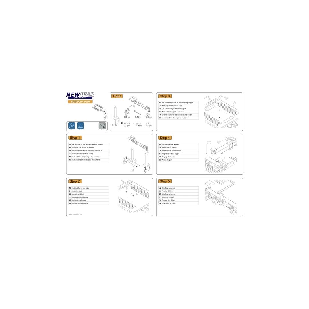 NewStarsin ainutlaatuisen kallistus- (30°) ja kääntötekniikan (180°) ansiosta kiinnike voidaan muuttaa mihin tahansa katselukulmaan, jotta kannettavan tietokoneen ominaisuuksista saadaan täysi hyöty. Kiinnike on käsin korkeussäädettävissä 0-26 cm. Syvyys säädettävissä 0-57 cm. Ainutlaatuinen kaapelinhallinta piilottaa ja reitittää kaapelit kiinnikkeestä kannettavaan tietokoneeseen. Piilota kaapelit ja pidä työpaikka siistinä.