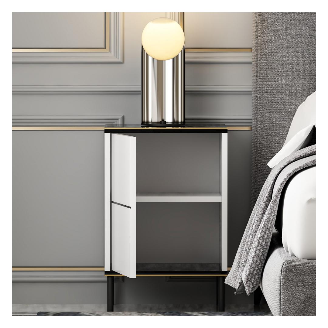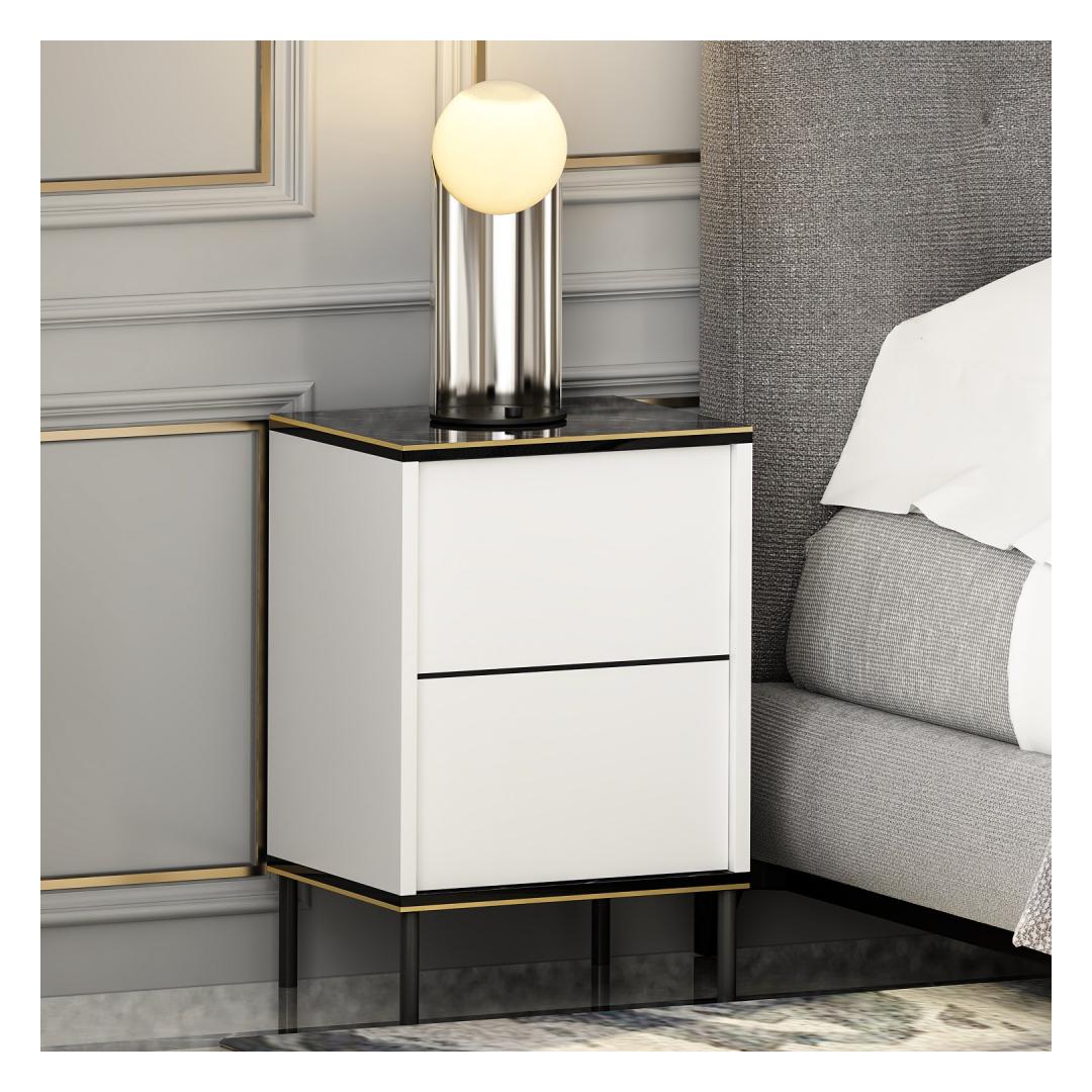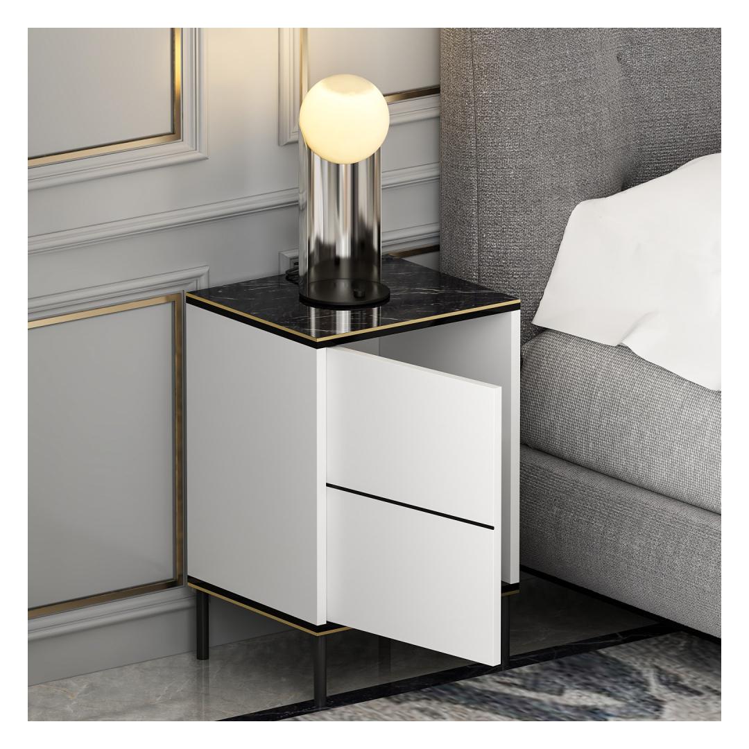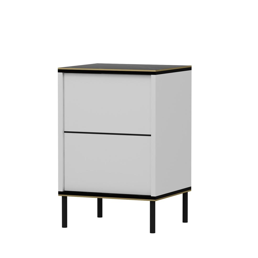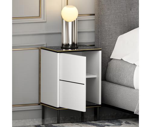 Introducing our stunning nightstand, a must-have piece for any bedroom. This nightstand is not just a piece of furniture, it's a statement of style and sophistication. The sleek design and elegant color combination of white, black, and gold will instantly elevate the look of your bedroom, creating a luxurious and inviting atmosphere.