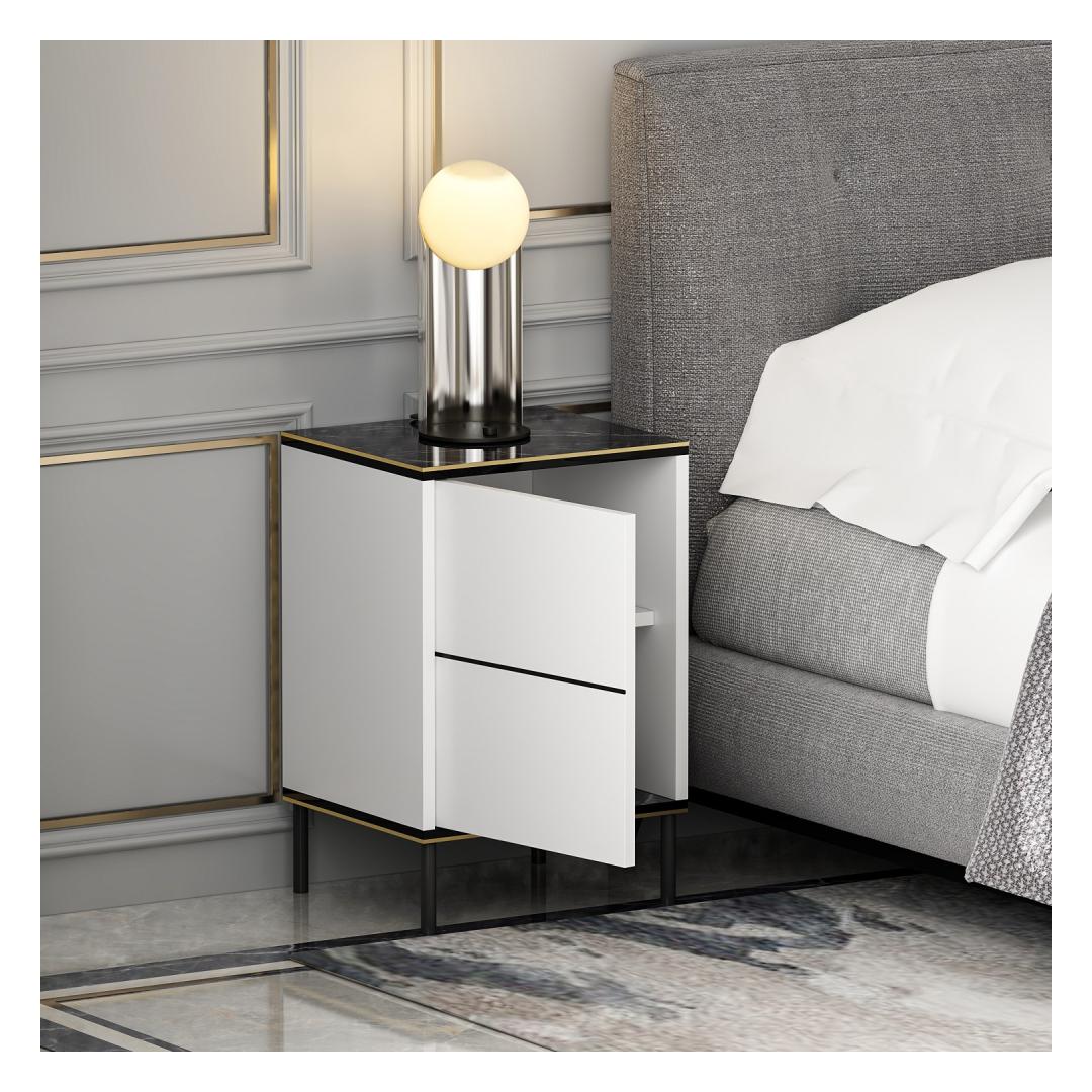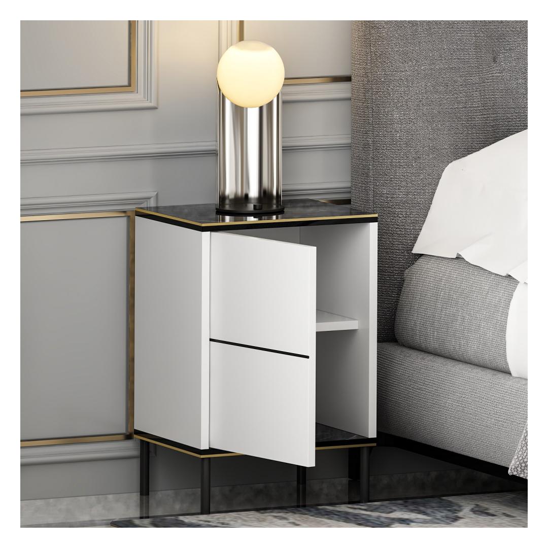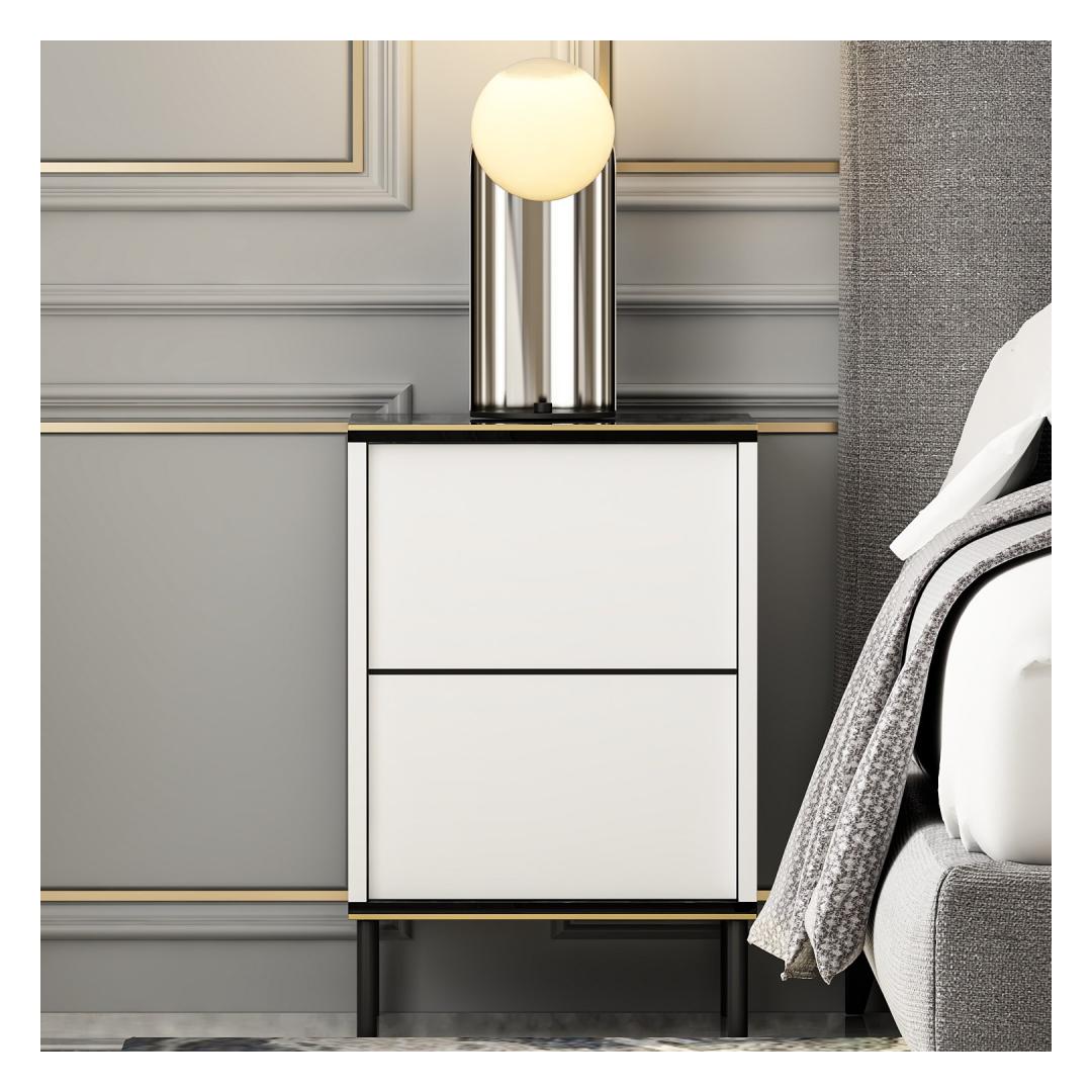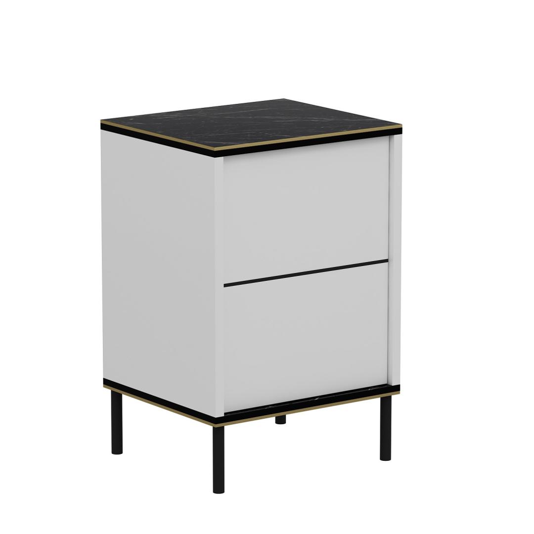Introducing our stunning nightstand, a must-have piece for any bedroom. This nightstand is not just a piece of furniture, it's a statement of style and sophistication. The sleek design and elegant color combination of white, black, and gold will instantly elevate the look of your bedroom, creating a luxurious and inviting atmosphere.