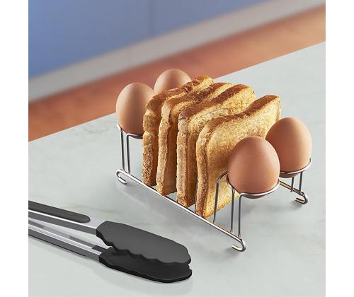 • Included: easy-grip tongs, toast and egg rack