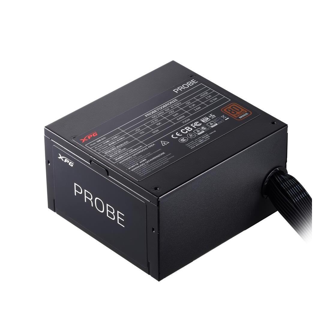 XPG PROBE 700 BRONZE Power Supply. Total power: 700 W, AC input voltage: 100 - 240 V, AC input frequency: 47 - 63 Hz. Motherboard power connector: 20+4 pin ATX, Cabling type: Non-Modular. Purpose: PC, Power supply unit (PSU) form factor: ATX, 80 PLUS certification: 80 PLUS Bronze. Product colour: Black, Cooling type: Active, Fan diameter: 12 cm. Certification: CB, CE, FCC, TUV, cTUVus, BSMI, CCC, NOM, FCC IC, UKCA,EAC, RCM