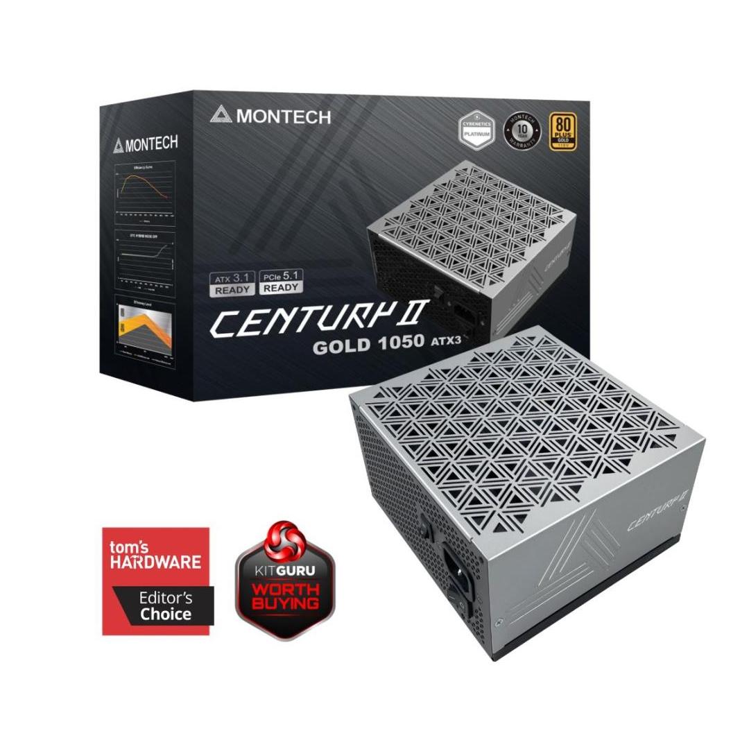Montech CENTURY II 1050W. Total power: 1050 W, AC input voltage: 100 - 240 V, AC input frequency: 50/60 Hz. Motherboard power connector: 20+4 pin ATX, Motherboard power cable length: 60 cm, SATA power cable length: 950 mm. Purpose: PC, Power supply unit (PSU) form factor: ATX, 80 PLUS certification: 80 PLUS Gold. Product colour: Silver, Cooling type: Active, Fan diameter: 13.5 cm. Cables included: PCIe, Peripheral (Molex), SATA, CPU