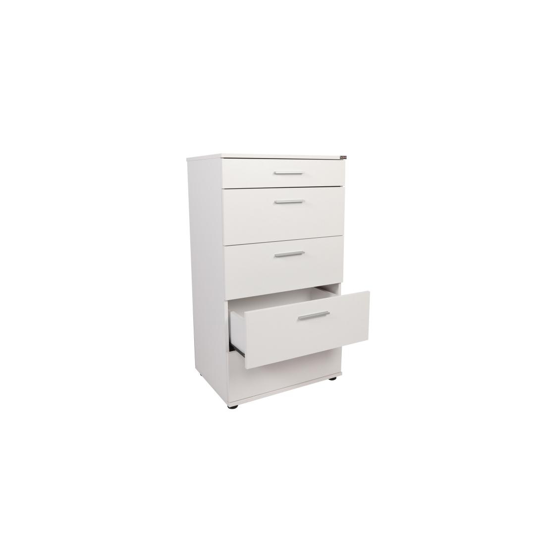 Etsitkö vaatekaappia, joka ei vain lisää tilasi toiminnallisuutta, vaan tuo myös eleganssia ja hienostuneisuutta? Sitten olet oikeassa paikassa! Kauniin puhtaan valkoisen värinen 5-laatikollinen vaatekaappimme on täydellinen lisä mihin tahansa makuuhuoneeseen tai asuintilaan.Eleganssi ja toiminnallisuus yhdistyvätTämä vaatekaappi ei ole vain huonekalu, vaan tyylin ja maun ilmaus. Sen tyylikäs muotoilu ja selkeät linjat tekevät siitä monipuolisen kappaleen, joka täydentää minkä tahansa sisustuksen modernista perinteiseen. viisi tilavaa laatikkoa tarjoavat runsaasti tilaa vaatteillesi, asusteille ja muulle, jolloin tilasi pysyy järjestyksessä ja sotkuisena.Laadukas käsityöTämä kaappi on valmistettu 100-prosenttisesti melamiinipinnoitetusta lastulevystä, joten se on paitsi kestävä ja pitkäikäinen, myös helppo puhdistaa ja huoltaa. 16 mm:n paksuus takaa lujuuden ja vakauden, ja tyylikäs valkoinen viimeistely tuo tilaan ripauksen tyylikkyyttä.Luo unelmiesi tilaOlipa tavoitteenasi päivittää makuuhuoneesi tai luoda lisätilaa olohuoneeseesi, tämä kaappi on täydellinen valinta. Ylälaatikko sopii täydellisesti pienemmille tavaroille, kun taas alalaatikot tarjoavat runsaasti tilaa suuremmille tavaroille. Lisäksi mahdollisuus kiinnittää se seinään antaa lisää turvallisuutta.Tekniset tiedot:Materiaali:100 % melamiinipinnoitettu lastulevyPaksuus: 16 mmLeveys: 60 cmKorkeus: 108 cmSyvyys: 44 cm4 laatikkoa:1 ylälaatikko (Leveys: 73 cm, Korkeus: 12 cm, Syvyys: 44 cm) ja 4 alalaatikkoa (Leveys: 73 cm, Korkeus: 22 cm, Syvyys: 44 cm)Väri: valkoinen Väri: valkoinen