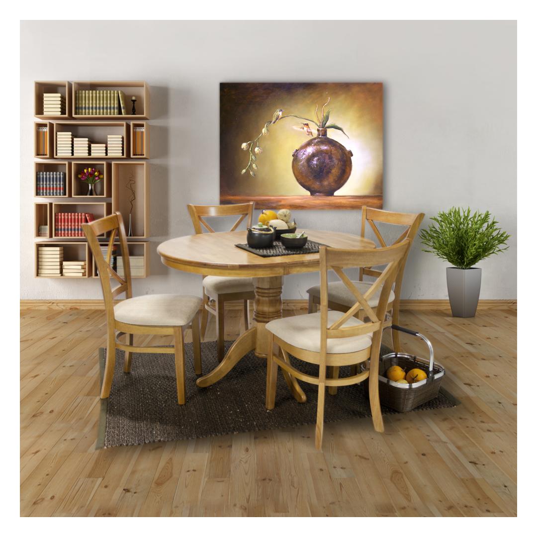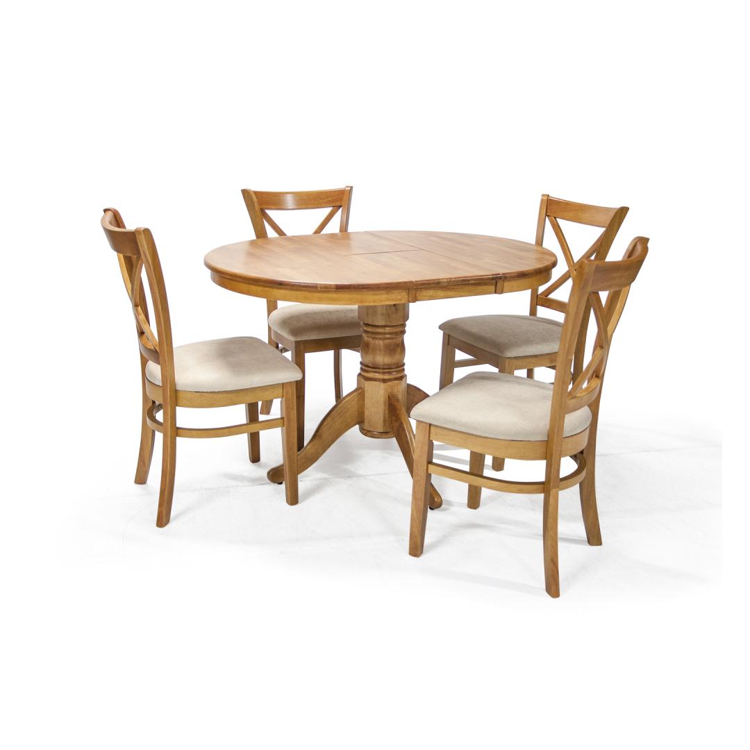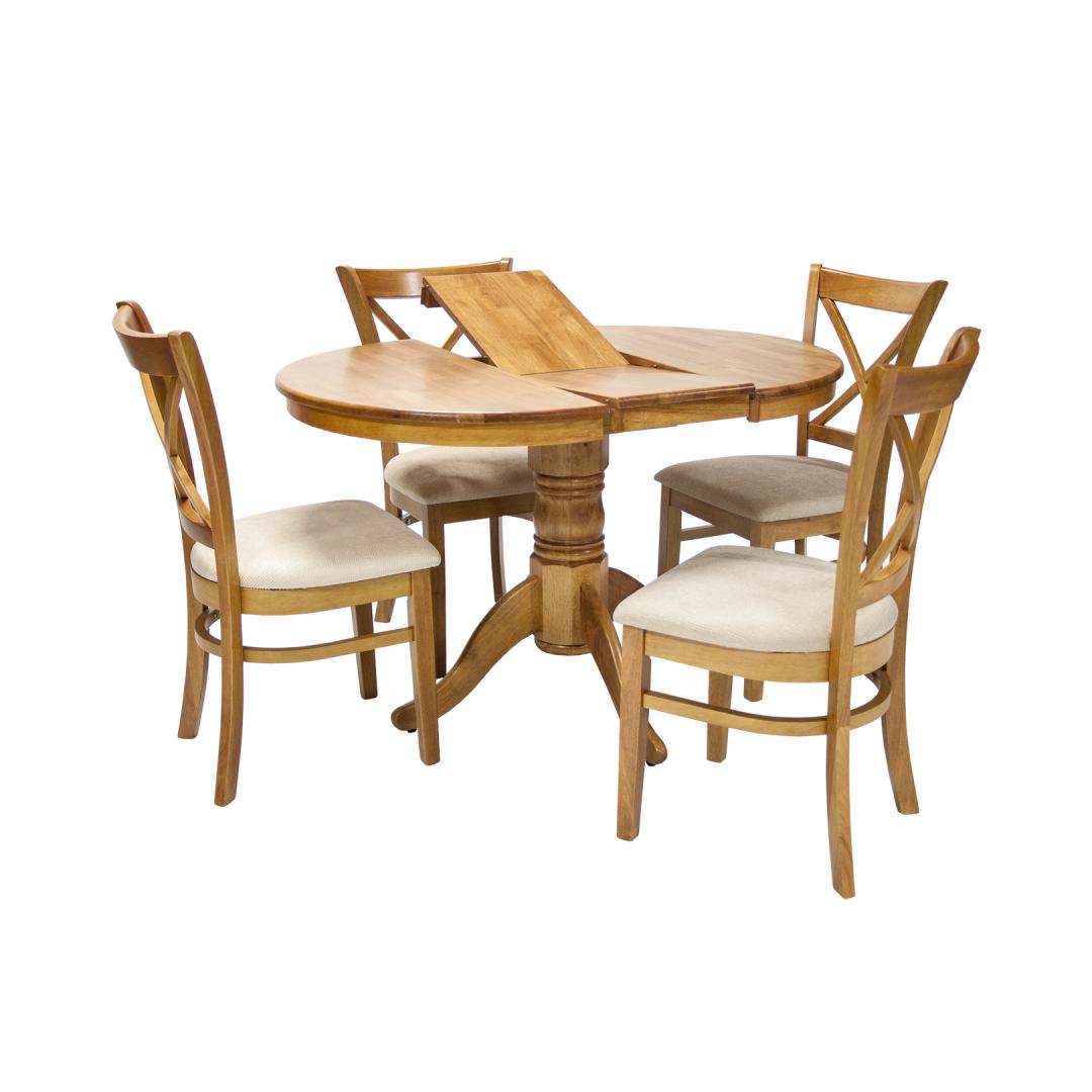 MIX & MATCH-ruokapöydän setti, jossa on jatkettava pöytä ja 4 tuolia. Pöydän mitat D90+30xH74cm. Pöytä on valmistettu kumipuusta ja viimeistelty vaalealla tammilakalla. Pöytälevy aukeaa keskeltä ja jatkopöytä asetetaan kahden sivun väliin. pöytälevyn alle sijoitetaan 30 cm leveä kokoontaitettava välilevy. Tuoli MIX &MATCH 43x43xH90,5cm. Pehmustettu istuin luonnonvalkoisella kankaalla. Kumipuujalat ja runko viimeistelty vaalealla tammilakalla. Painoraja 100kg.