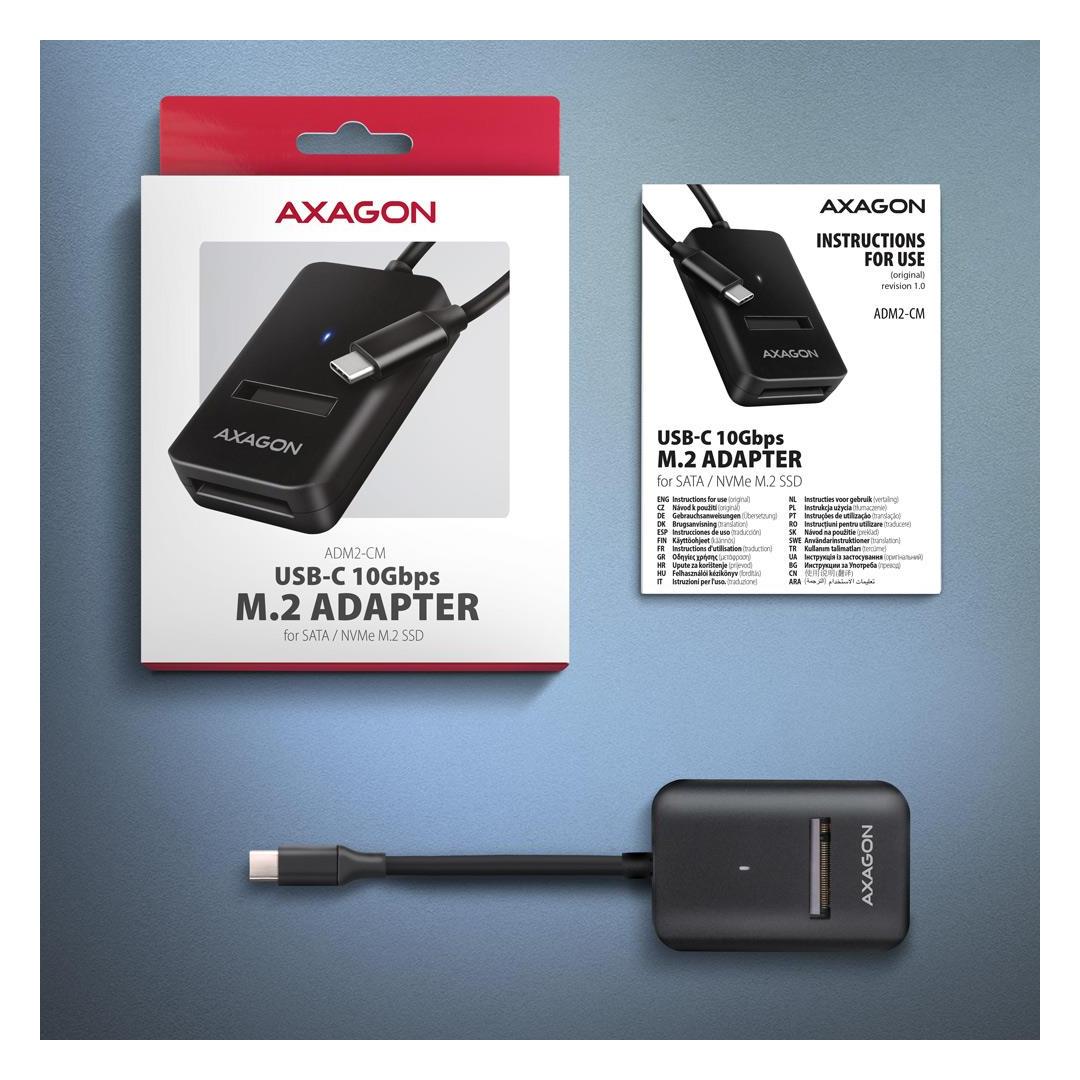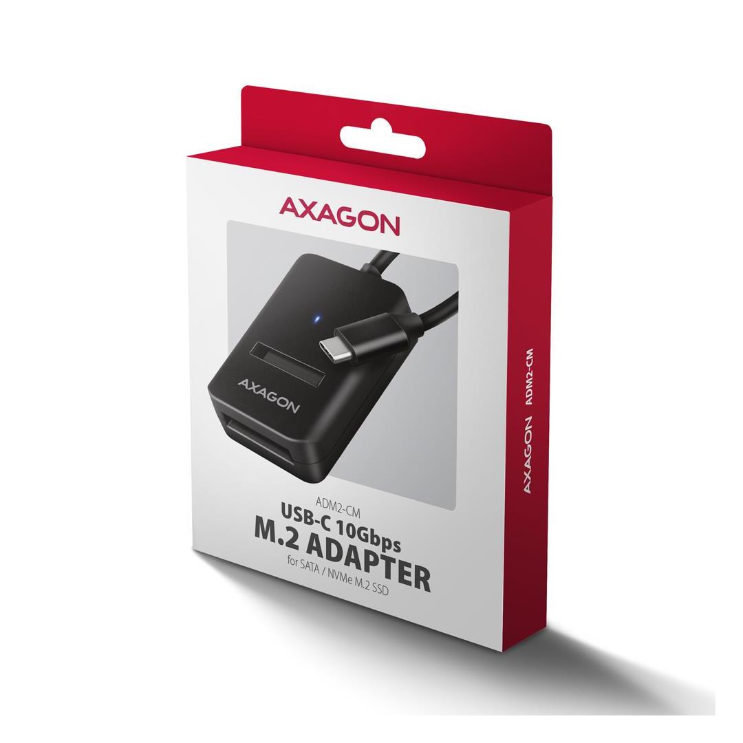 Kompakti AXAGON ADM2-CM M.2-sovitin USB 10 Gbps -liitännällä, joka on suunniteltu M.2 NVMe- tai SATA SSD-asemien helppoon käyttöön. AXAGON ADM2-CM M.2-sovitin USB 10 Gbps -liitännällä, joka on suunniteltu M.2 NVMe- tai SATA SSD-asemien helppoon käyttöön. Luotettava liitäntä tietokoneeseen on mahdollista 10 cm:n pituisen kiinteän USB-C-kaapelin ansiosta.