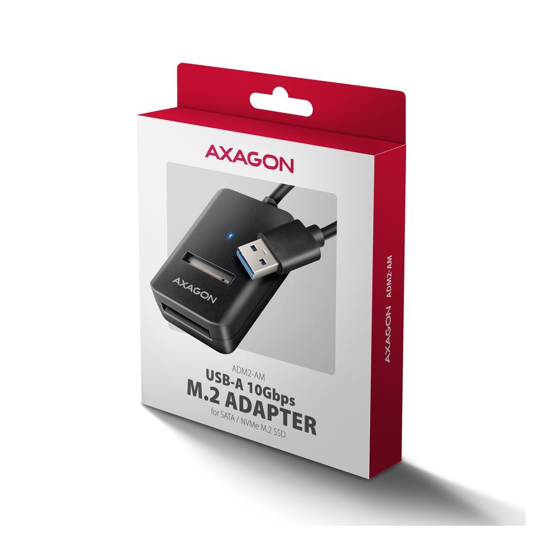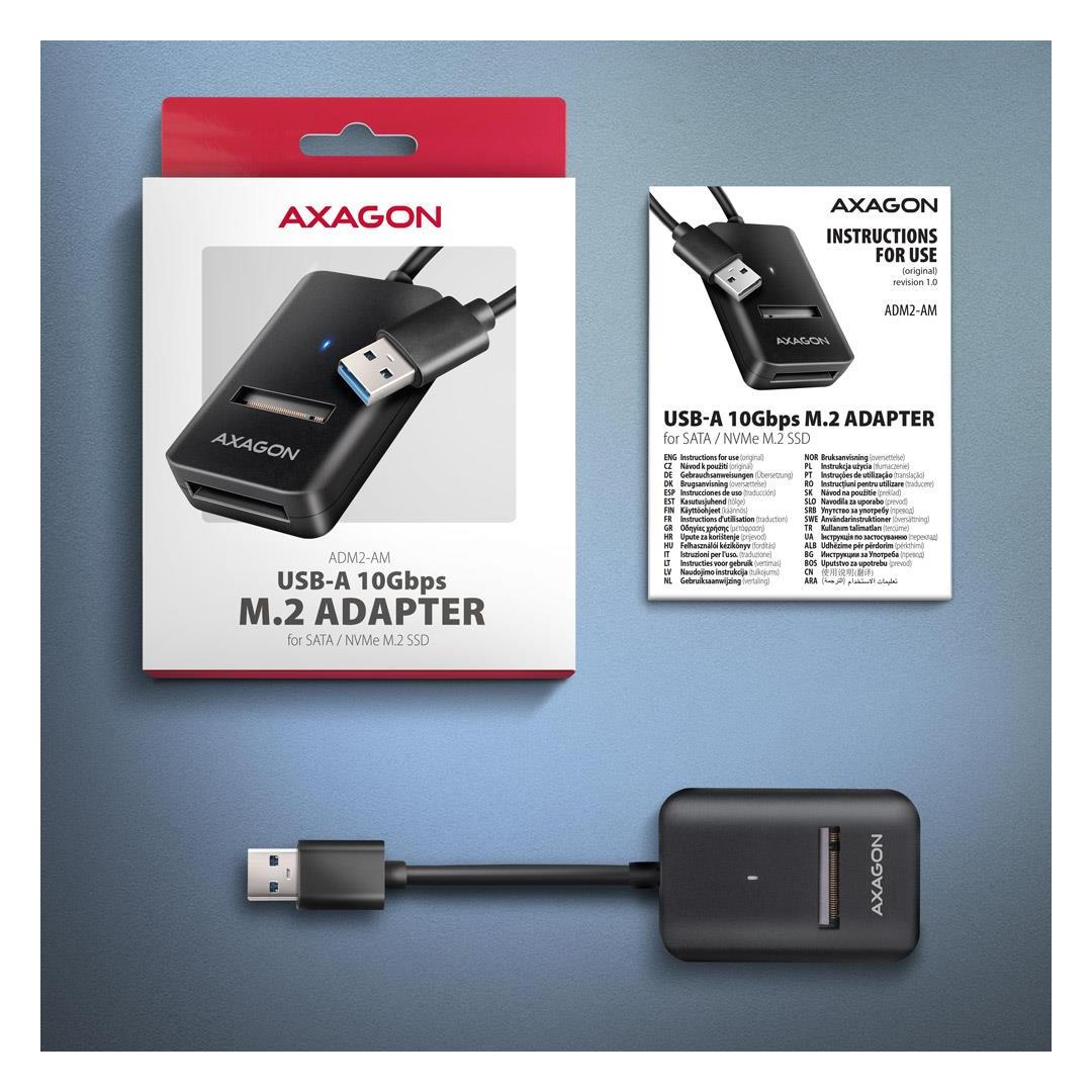Kompakti AXAGON ADM2-AM M.2-sovitin USB 10 Gbps -liitännällä, joka on suunniteltu M.2 NVMe- tai SATA SSD-asemien helppoon käyttöön. AXAGON ADM2-AM M.2-sovitin USB 10 Gbps -liitännällä, joka on suunniteltu M.2 NVMe- tai SATA SSD-asemien helppoon käyttöön. Luotettava liitäntä tietokoneeseen on mahdollista 10 cm:n pituisen kiinteän USB-A-kaapelin ansiosta.