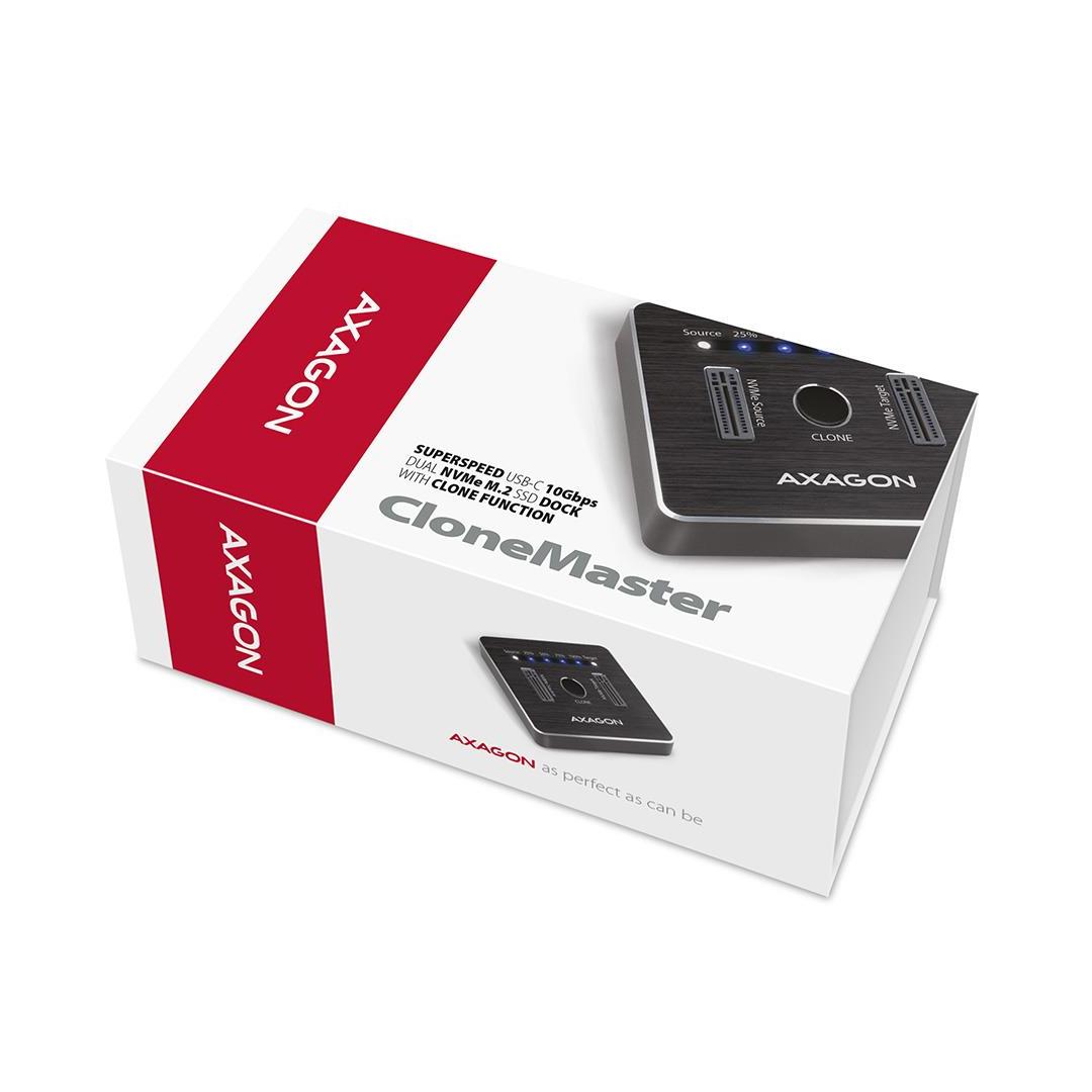 AXAGON ADSA-M2C DUAL NVMe CLONE MASTER DOCK SuperSpeed USB-C 10 Gbps -telakointiasema yhdistää nopeasti ja helposti jopa kaksi NVMe (PCI-Express) M.2 SSD-levyä tietokoneeseen. Mukava liitäntä mahdollistaa käännettävän USB-C-liittimen. Löydät pakkauksesta kaksi kaapelia laatikon liittämiseen - tavallinen USB-C -> USB-A-kaapeli ja myös USB-C -> USB-C-kaapeli.