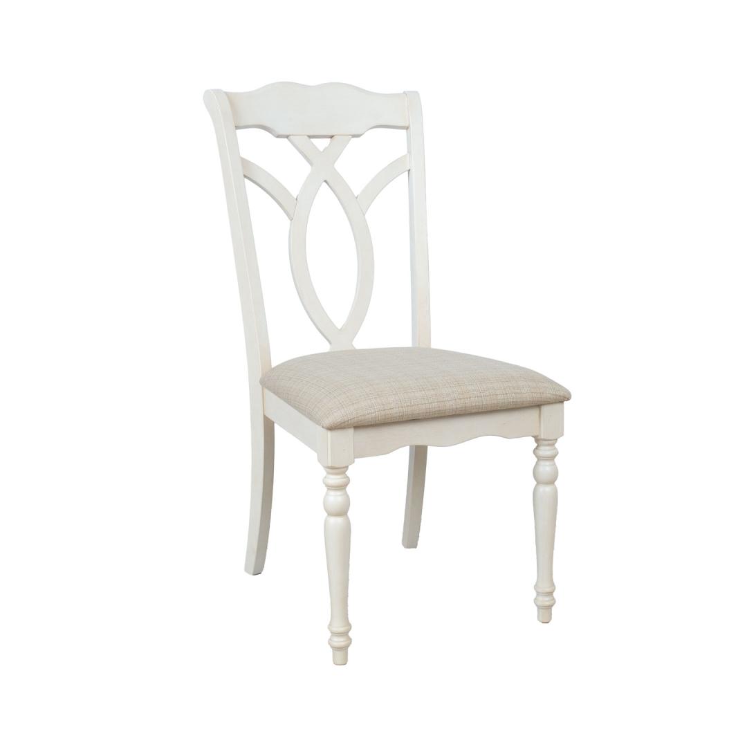 Selkänoja, jalat ja runko on valmistettu kumipuusta ja viimeistelty antiikkivalkoiseksi.