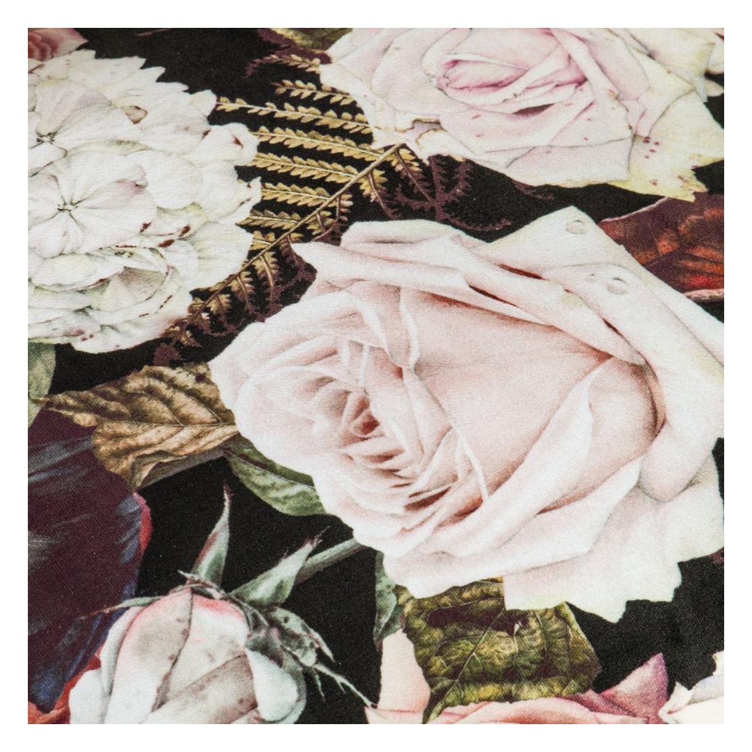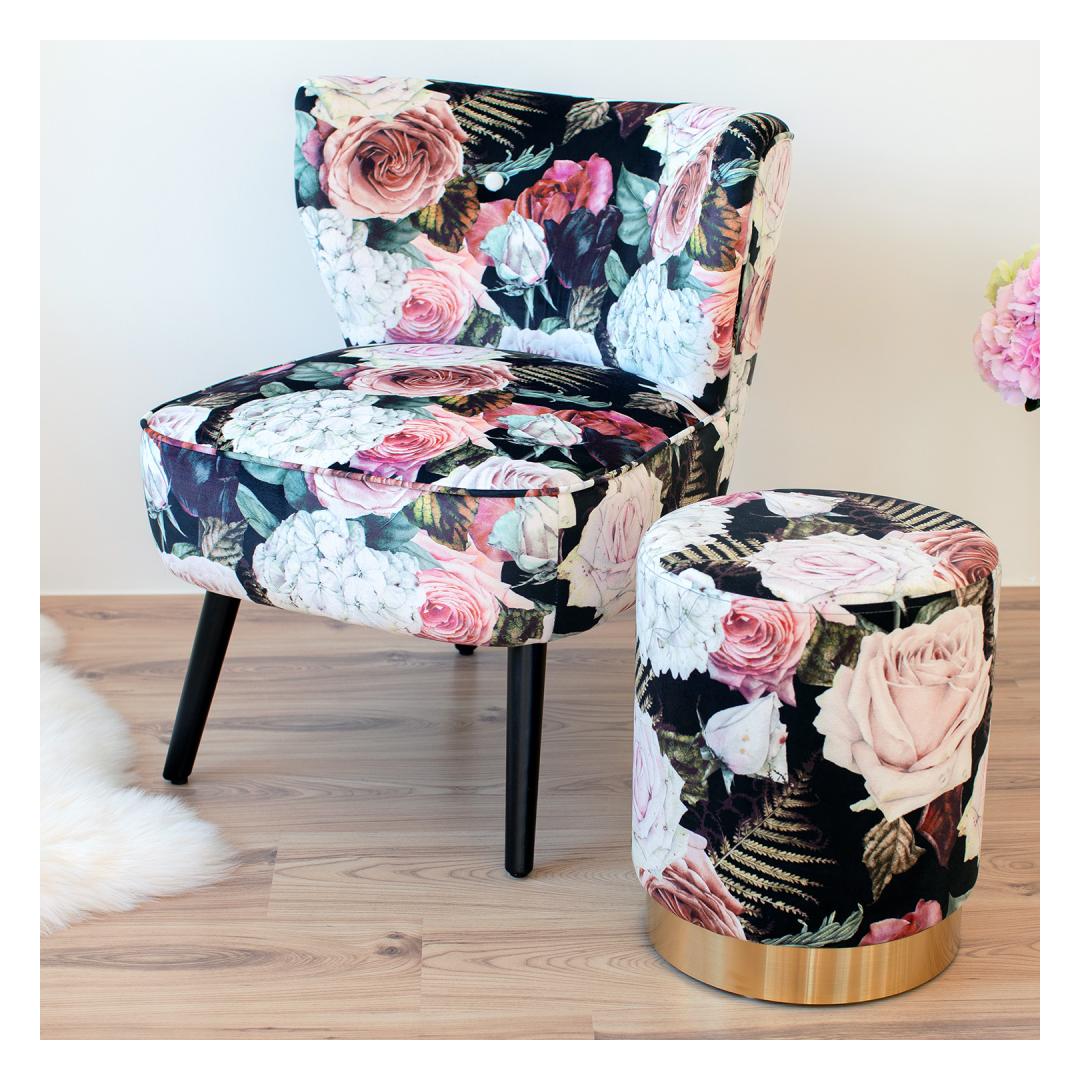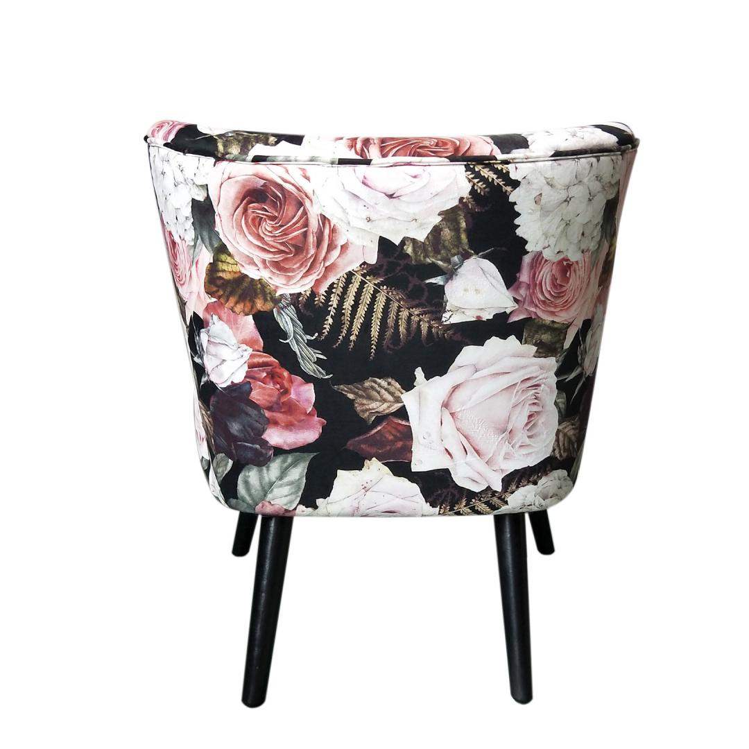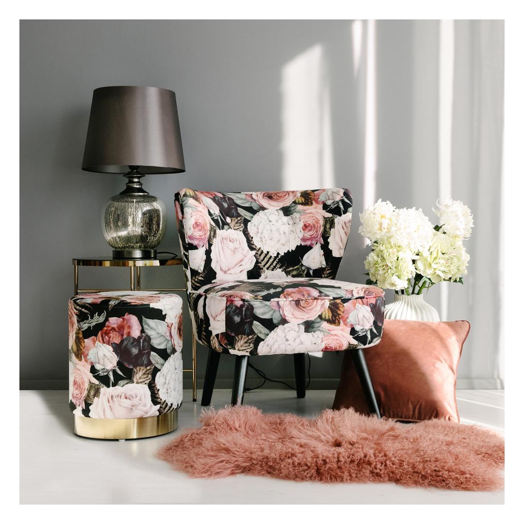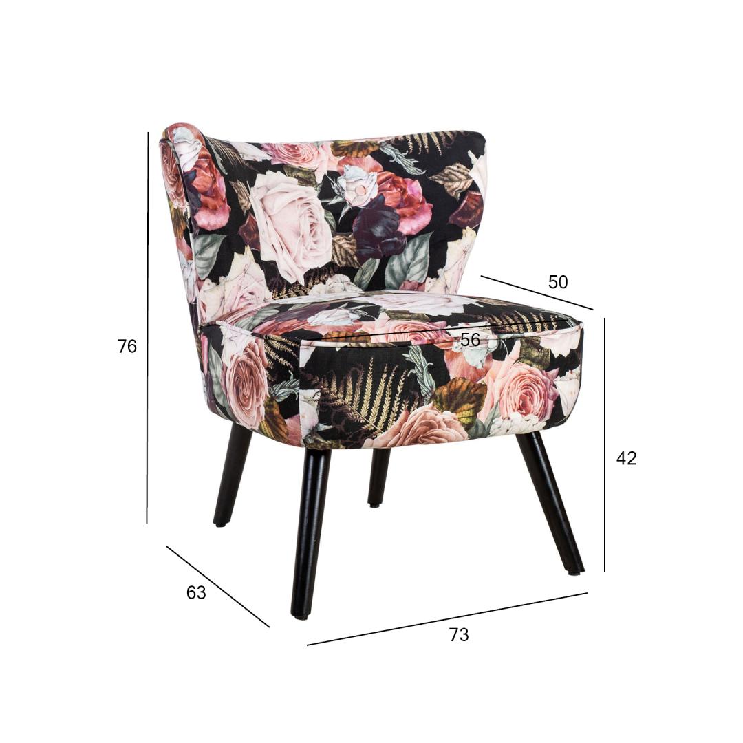 Nojatuoli LA PERLA kukka. Nojatuoli on verhoiltu ruusukuvioisella samettikankaalla, 100 % polyesteriä. Nojatuolissa on puurunko ja polyesteripehmuste. Nojatuolin mitat ovat 63x73xH76cm.