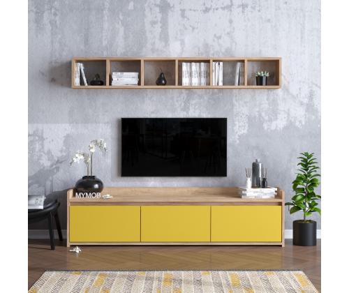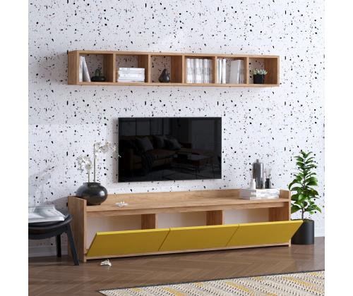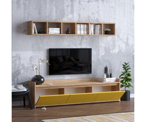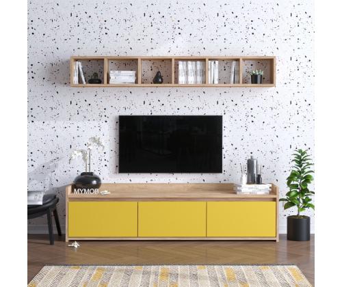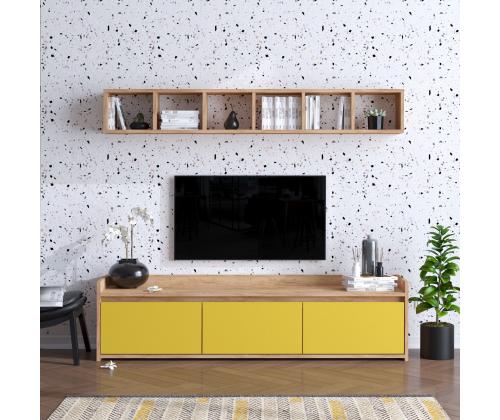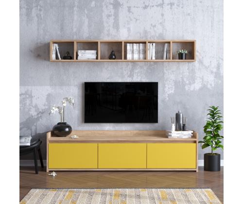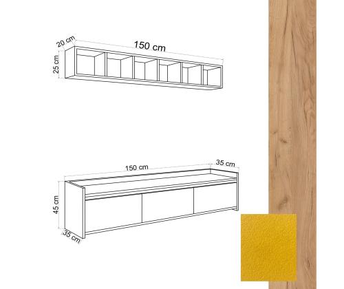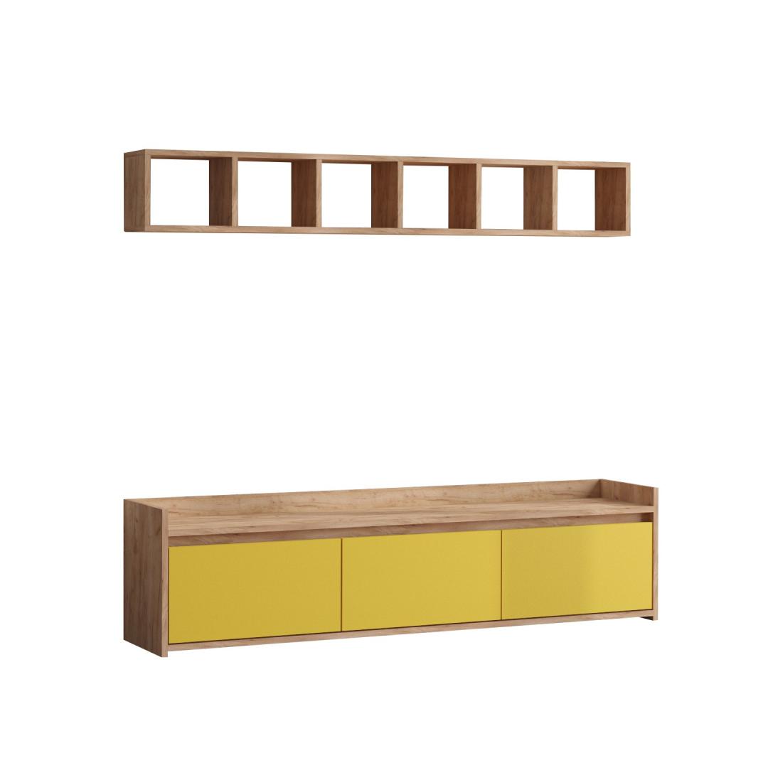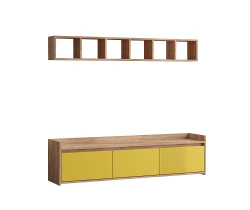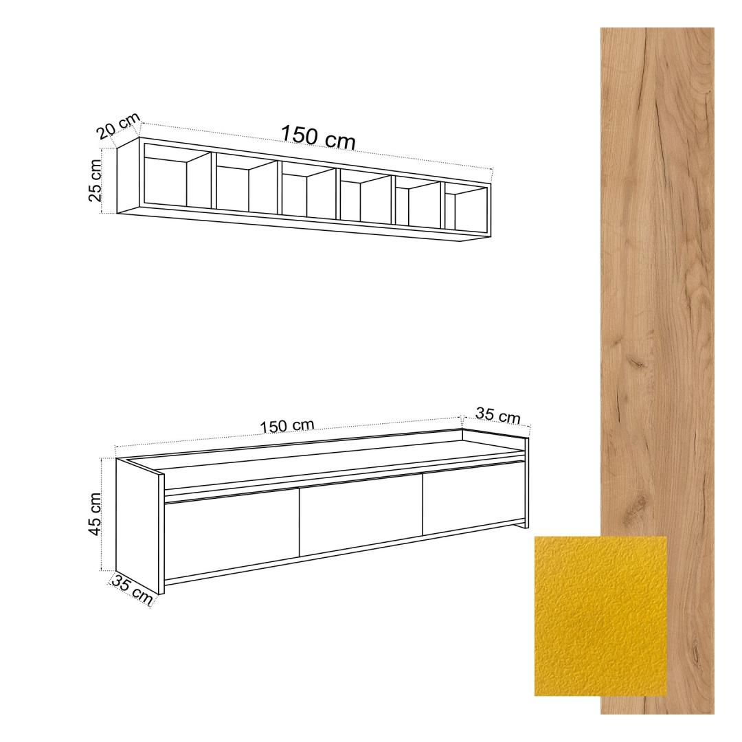 Transformeeri oma elutuba meie moodsa ja uudse teleriga!Uuendage oma eluruumi meie stiilse ja kaasaegse teleriga. Valmistatud 100% melamiiniga kaetud puitlaastplaadist, ei ole see üksus mitte ainult vastupidav, vaid lisab ka elegantsi teie kodu sisustusele. Looge oma unikaalse disainiga statementTamme ja kollase värvi kombinatsiooniga paistab meie telerikomplekt silma. Selle kaasaegne ja uudne kontseptsioon lisab igasse ruumi värske ja trendika meeleolu.Rikkalik panipaik kõigi teie meelelahutusvajaduste jaoksArvukate riiulitega pakub see televiisoripaneel rohkelt hoiuruumi kõigile teie meelelahutuslikele esmatähtsatele asjadele. Alates DVD-dest kuni mängukonsoolideni saate hoida kõike organiseeritult ja käeulatuses. Monitoorne ja praktiline disainSeadme ülemise mooduli laius on 150 cm, kõrgus 45 cm ja sügavus 35 cm, alumise mooduli laius on 150 cm, kõrgus 25 cm ja sügavus 20 cm. Selline mitmekülgne disain võimaldab teil sobitada seda ideaalselt igasse elutoa nurka. Lihtne paigaldamine ja turvaline paigutamineMeie televiisori saab hõlpsasti seinale kinnitada, tagades stabiilsuse ja ohutuse. Saate nautida oma lemmiksaateid ja filme, ilma et peaksite muretsema õnnetuste pärast. Tehnilised üksikasjad:Materjal: Materjal: Materjal: Materjal: Materjal: Materjal: Materjal: Materjal: materjal: 100% melamiiniga kaetud puitlaastplaatPaksus: 18 mmÜlemine mooduli suurus: Laius: 150 cm, kõrgus: 45 cm, sügavus: 35 cm.Alumise mooduli suurus: Laius: 150 cm, kõrgus: 25 cm, sügavus: 20 cm.Värv: Tamm ja kollaneKontseptsioon: Moodne - uudsus Värv: Oak Yellow